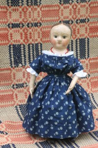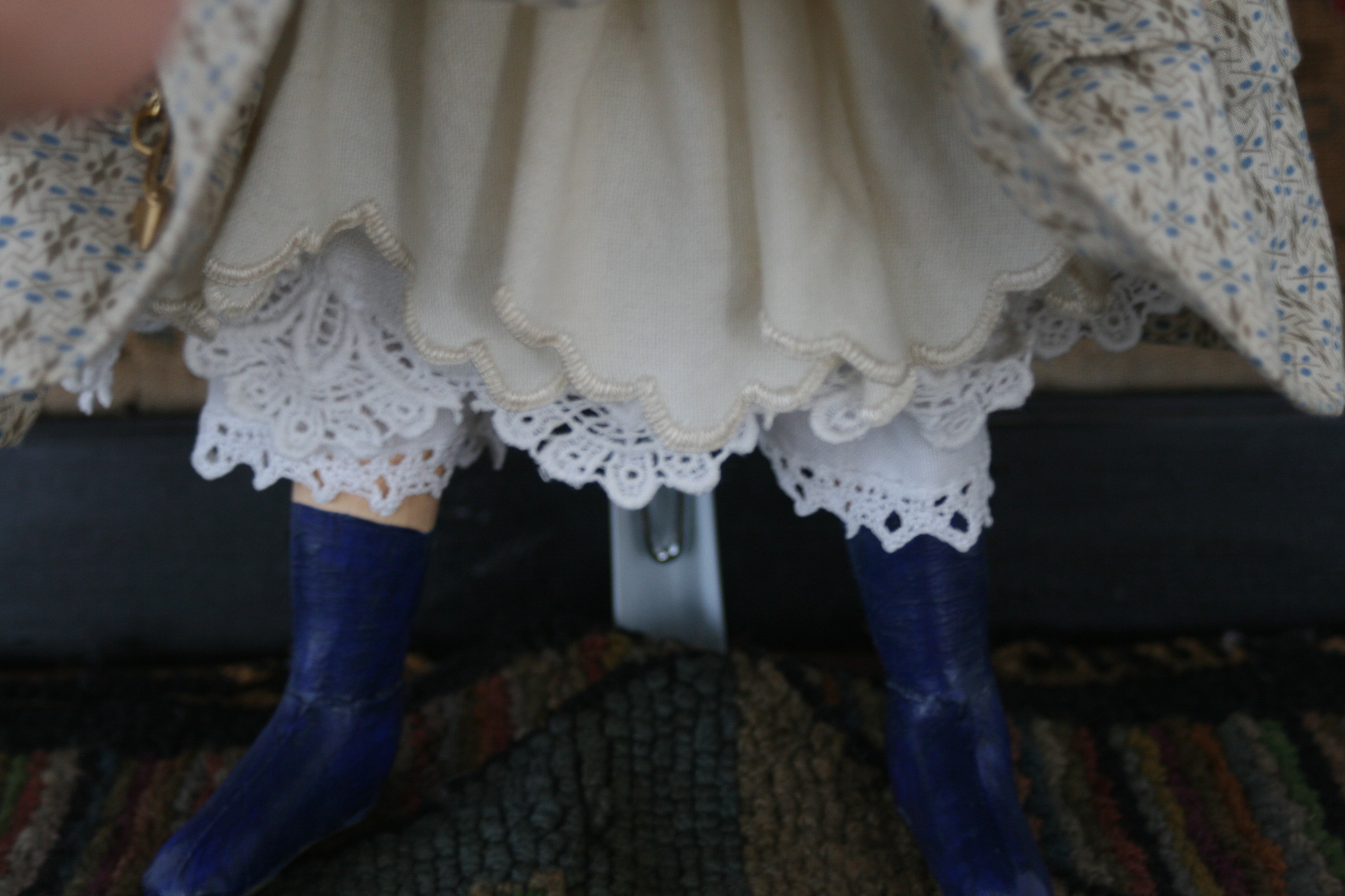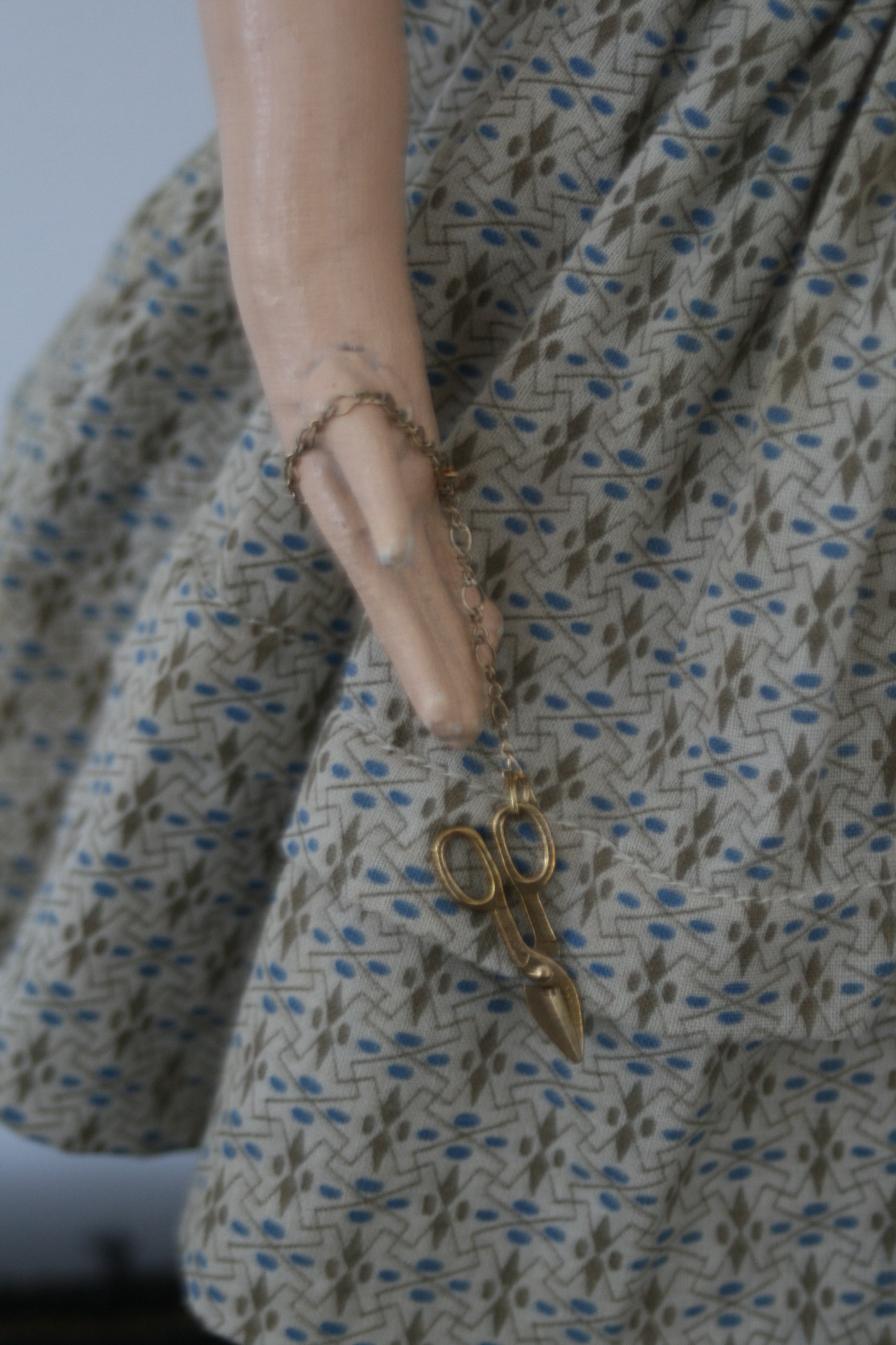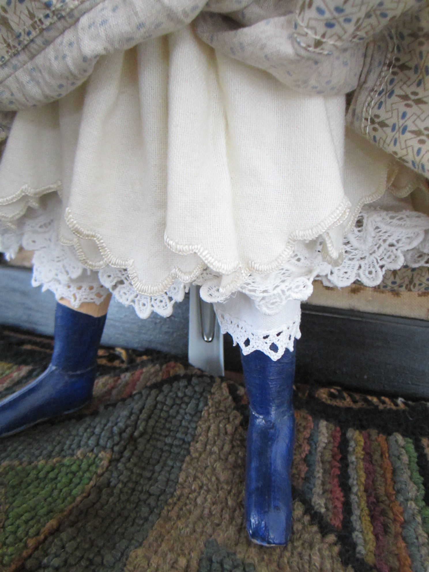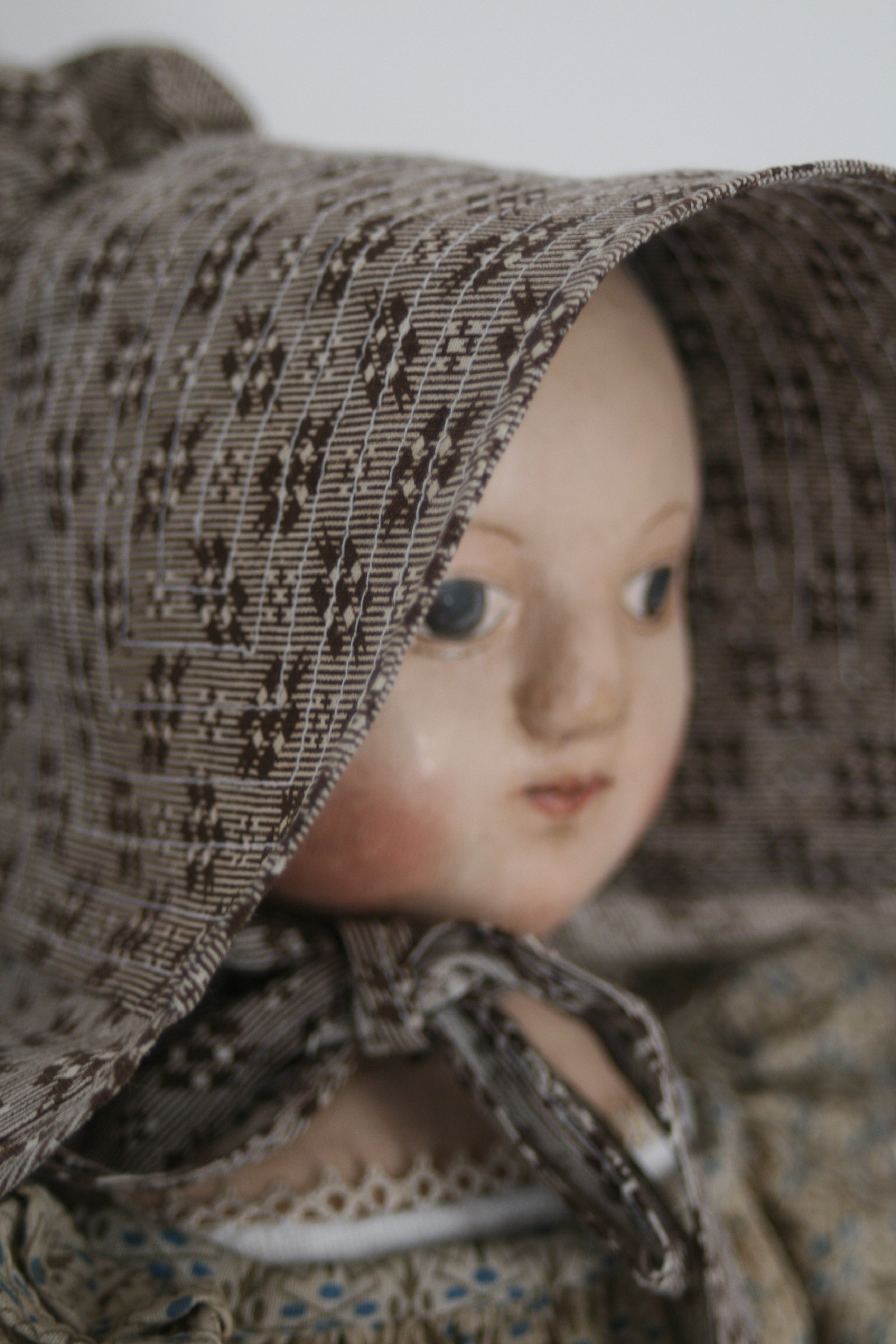 She is dressed in a wonderful thin olive brown and Prussian blue cotton print dress. The dress has one growth tuck in the skirt, and two tucks in its sort frilled sleeves. Antique cotton tape forms a drawstring at the neck of the dress and the waist is closed with a mid-19th century, blue painted, milk glass button. Her chemise and pantalettes are made from antique lace trimmed linen and her petticoat was fashioned from an unworn baby’s flannel petticoat with embroidered, scalloped edges. I had been looking through scores of images of antique Izannah Walker dolls prior to painting Isa #2 and some of those photographs showed dolls wearing blue shoes. I took a bit of license and used the inspiration of those blue leather shoes when choosing the color for Isa’s painted boots! Isa #2’s bonnet is made from a wonderful antique brown and white print cotton fabric. I’m making the bonnet optional on this doll because I have many other brown dress fabrics that it would also look great with. Around her wrist is a tiny chain that keeps her sewing scissors near, so that she can always find them when she needs to snip a thread. She is priced at $1250.00 and you may add the bonnet for an extra $100.00. Free, insured shipping to any U.S. address is included and of course she can be placed on lay-away if you need to. Feel free to contact me with any questions you have about this doll. You may purchase her by calling 860-355-5709, emailing paula@asweetremembrance.com; or fastest and easiest of all, by clicking here and going through the automatic checkout on my website.