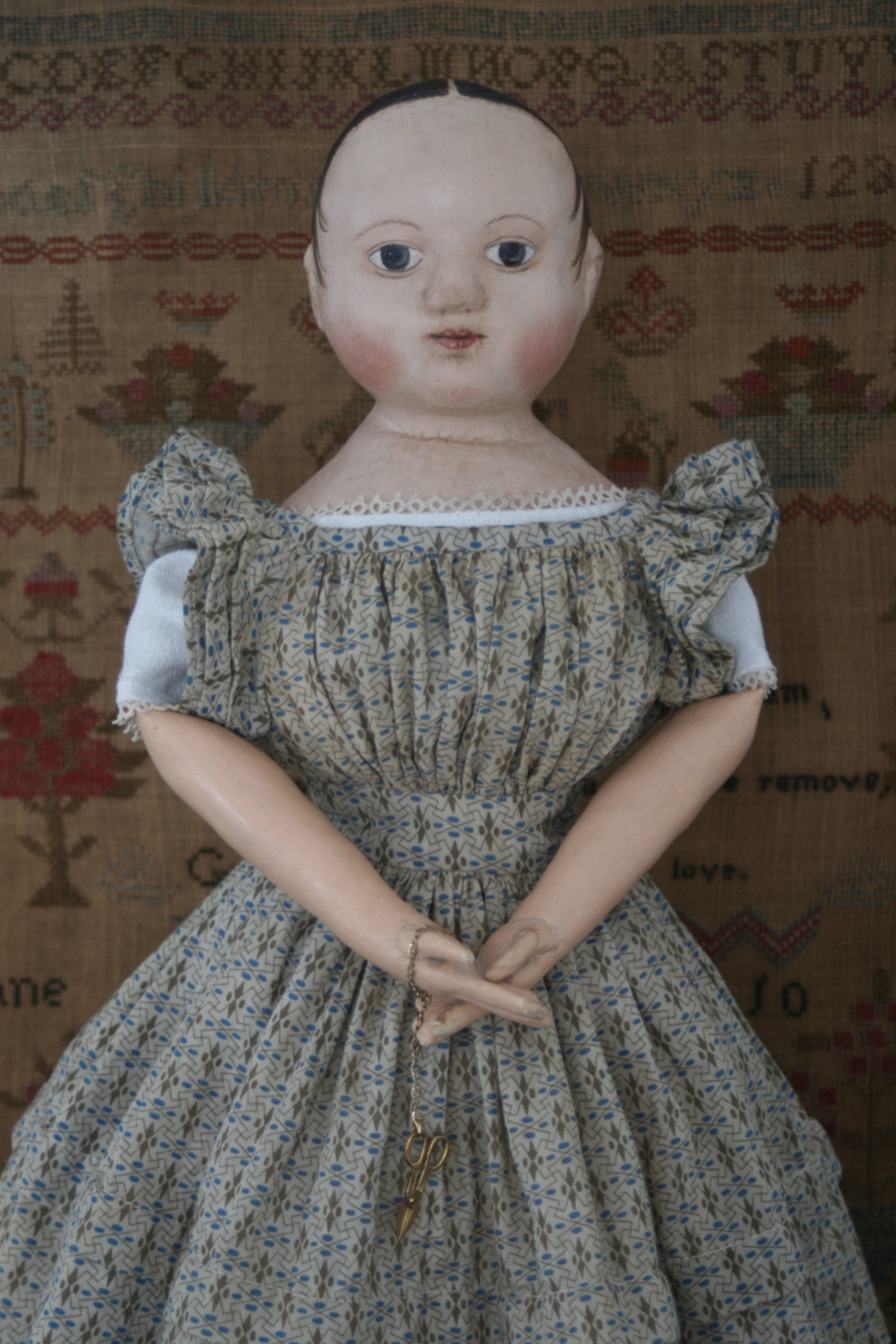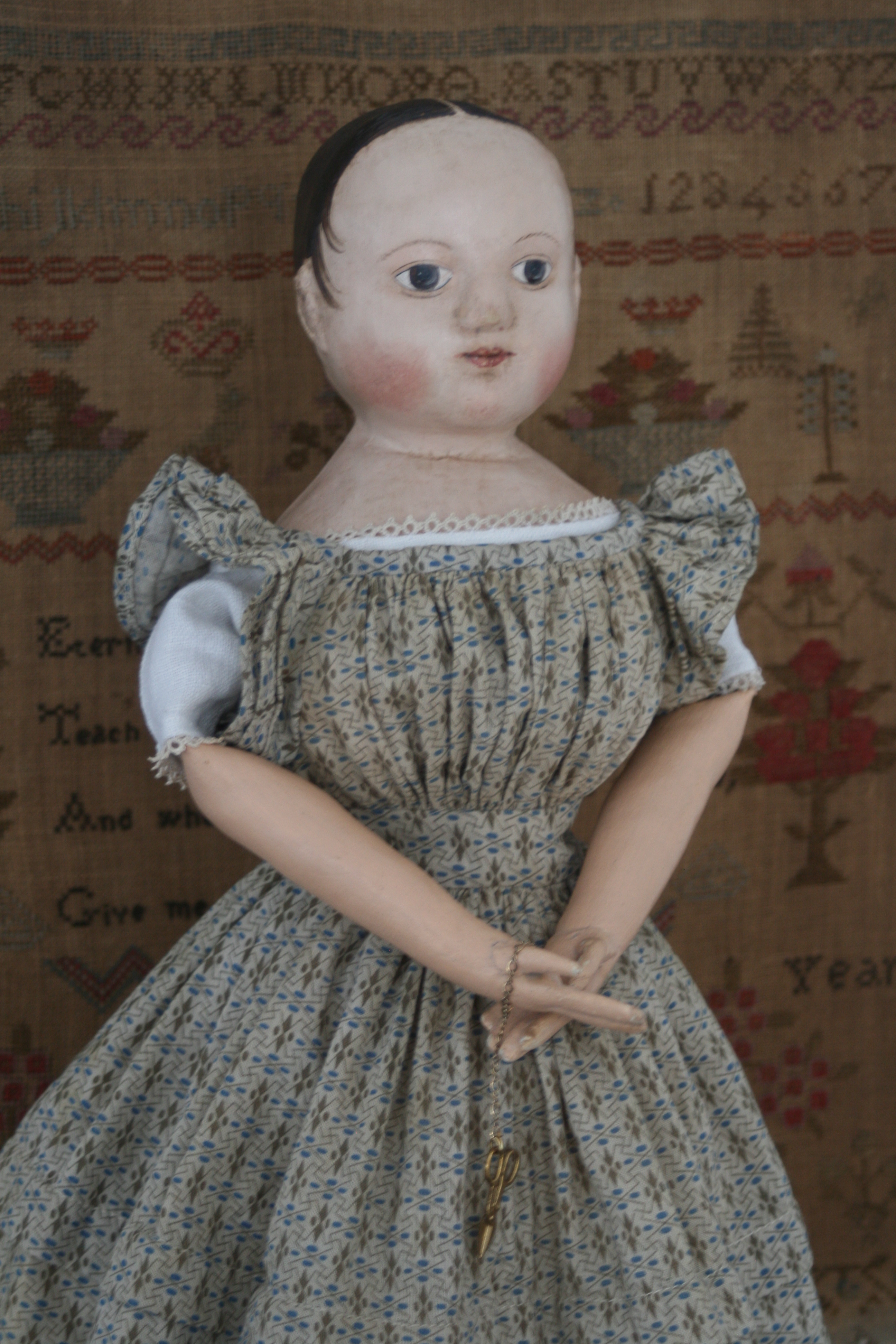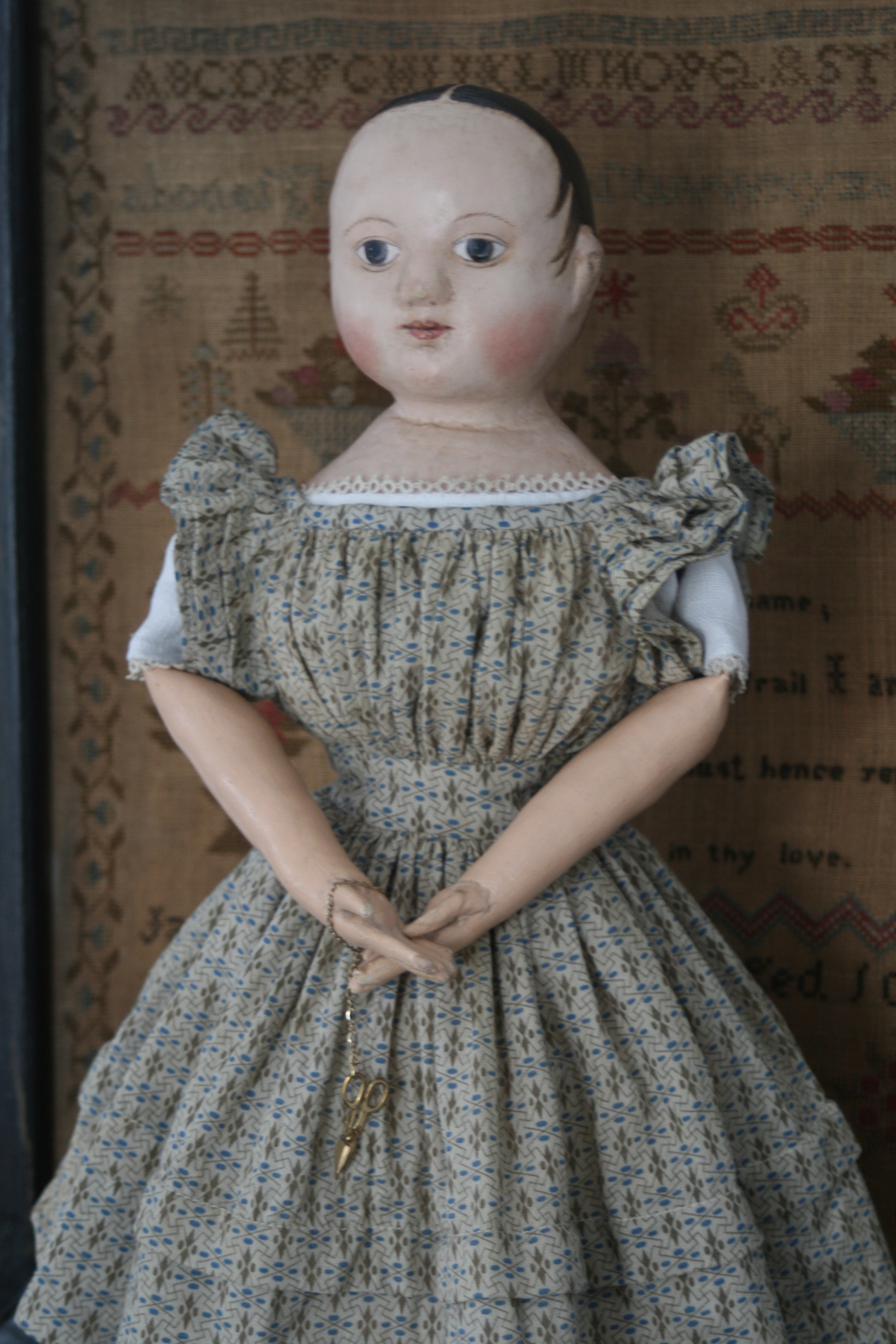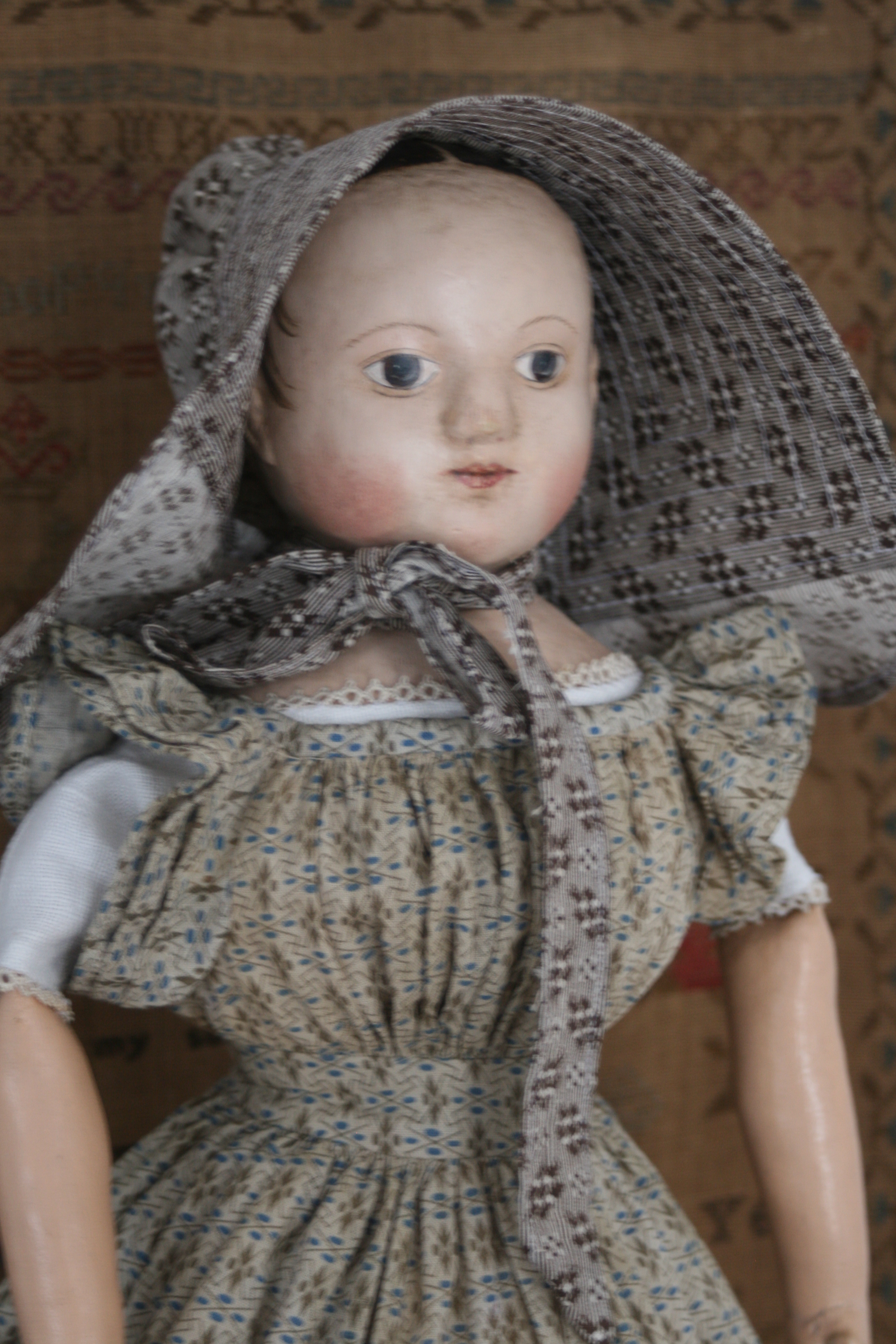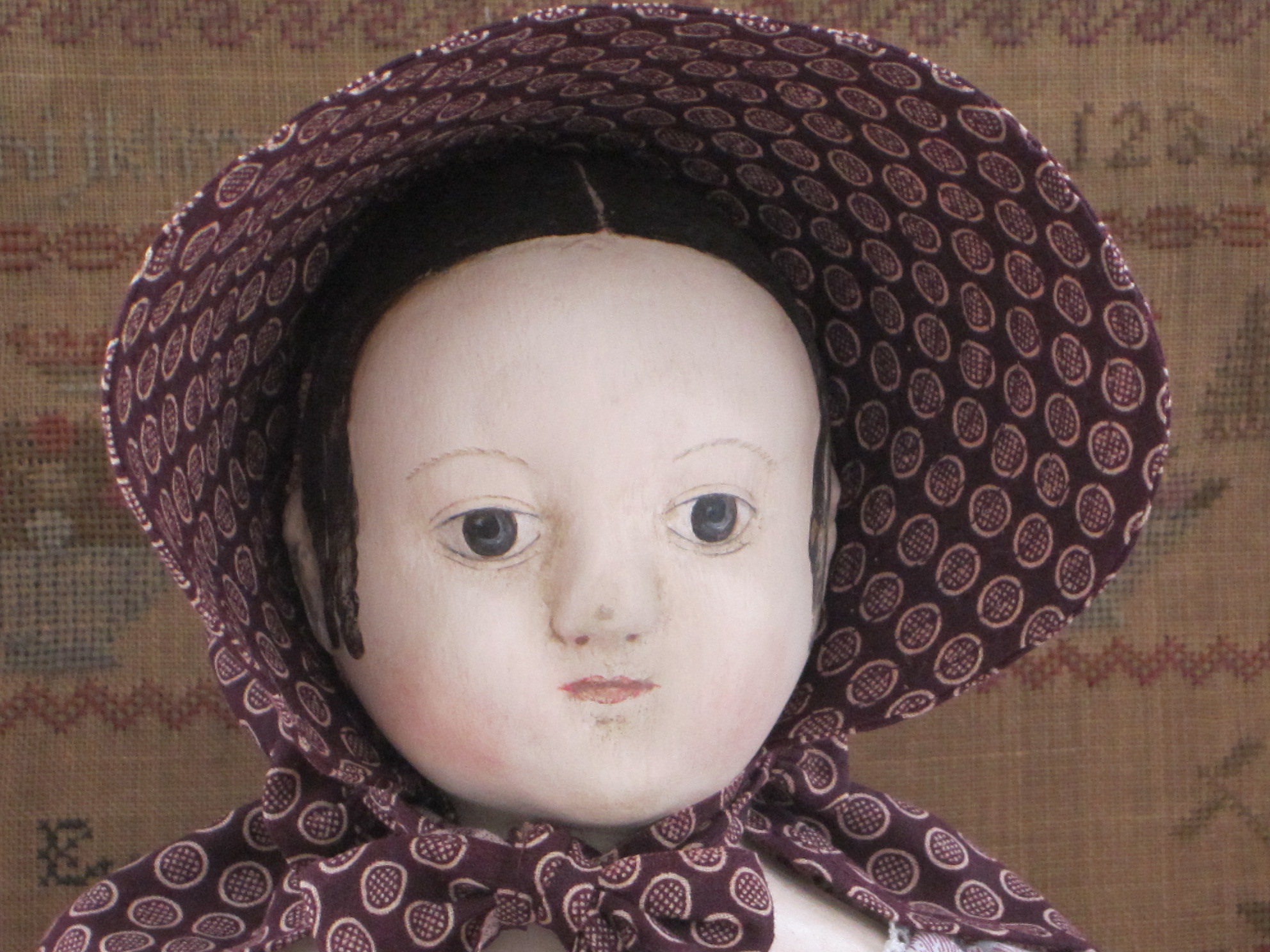 She is dressed in a wonderful thin olive brown and Prussian blue cotton print dress. The dress has one growth tuck in the skirt, and two tucks in its sort frilled sleeves. Antique cotton tape forms a drawstring at the neck of the dress and the waist is closed with a mid-19th century, blue painted, milk glass button. Her chemise and pantalettes are made from antique lace trimmed linen and her petticoat was fashioned from an unworn baby’s flannel petticoat with embroidered, scalloped edges. I had been looking through scores of images of antique Izannah Walker dolls prior to painting Isa #2 and some of those photographs showed dolls wearing blue shoes. I took a bit of license and used the inspiration of those blue leather shoes when choosing the color for Isa’s painted boots! Isa #2’s bonnet is made from a wonderful antique brown and white print cotton fabric. I’m making the bonnet optional on this doll because I have many other brown dress fabrics that it would also look great with. Around her wrist is a tiny chain that keeps her sewing scissors near, so that she can always find them when she needs to snip a thread. She is priced at $1250.00 and you may add the bonnet for an extra $100.00. Free, insured shipping to any U.S. address is included and of course she can be placed on lay-away if you need to. Feel free to contact me with any questions you have about this doll. You may purchase her by calling 860-355-5709, emailing paula@asweetremembrance.com; or fastest and easiest of all, by clicking here and going through the automatic checkout on my website.