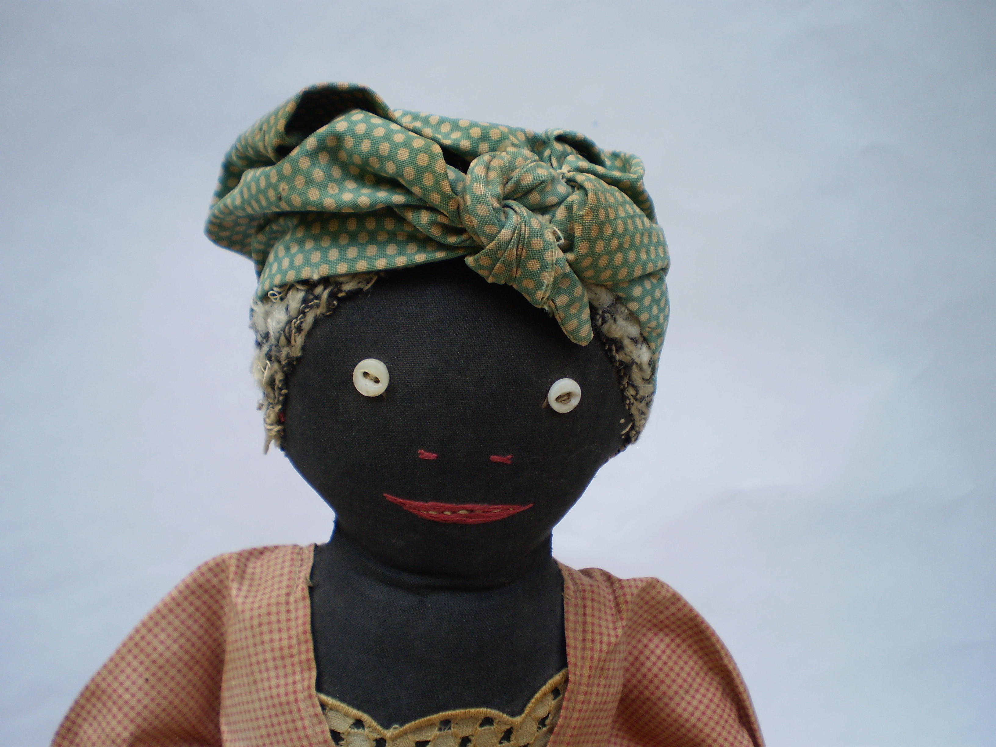 SOLD 18 inch black reproduction Izannah Walker doll. Fully dressed, all cloth doll without the bonnet.