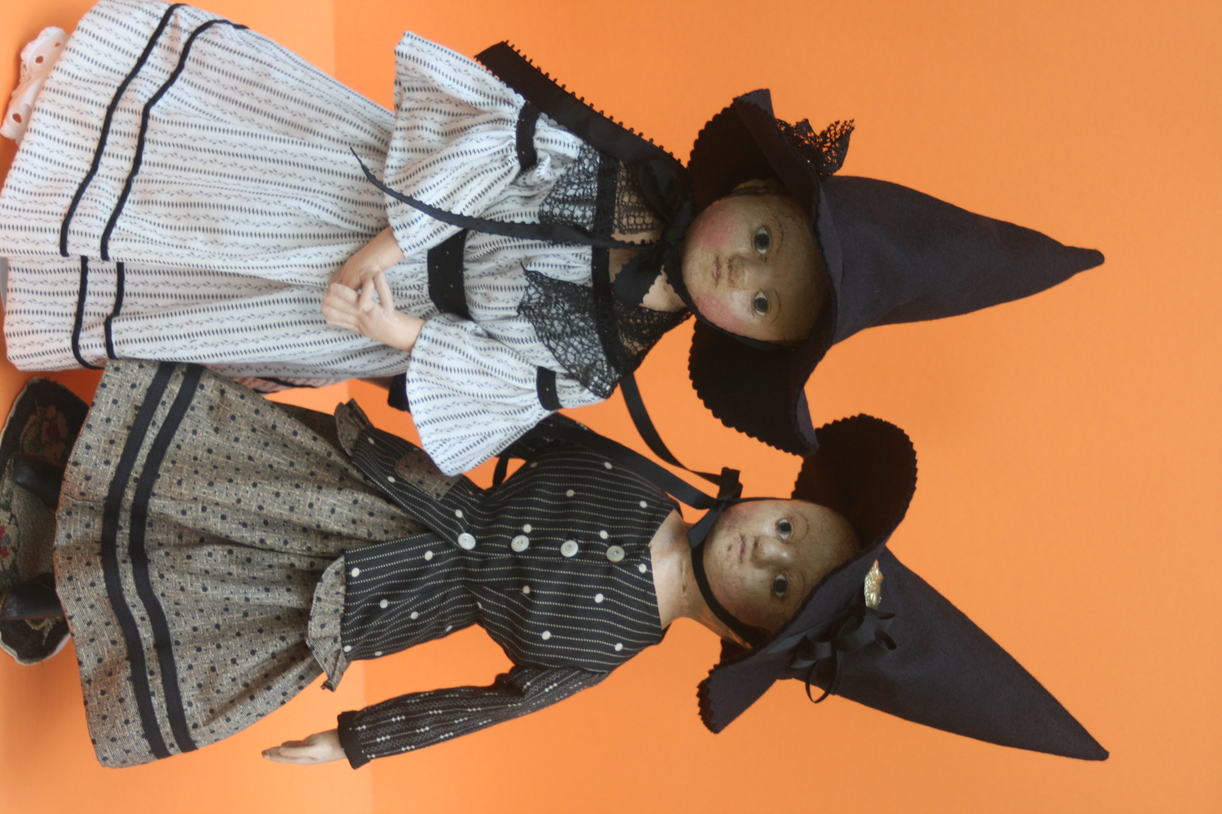 These two dolls have already found new homes. Thank you for dropping in to see them! Just for fun, the girls are dressed in antique mourning print fabrics and wool felt hats to celebrate All Hallows Eve. Pack their hats away after Halloween and pose them with antique daguerreotypes or tintypes for a stunning monochromatic year round display. Check back soon to see additional pieces in their wardrobes.