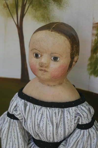 Isa #1 looks ever so much nicer in person. Her delicate coloring and very old looking paint do not show up all that well in photographs. Please feel free to contact me if you have any questions about her. She is $1350.00, which includes her bonnet and free, fully insured, postage within the United States. She may be placed on lay-away, or she is ready for immediate shipment. ISA #1 HAS FOUND A WONDERFUL NEW HOME. IF YOU WOULD LIKE A SIMILAR DOLL, YOU MAY PLACE AN ORDER FOR ONE. ALL ANTIQUE FABRICS ARE ONE OF A KIND.