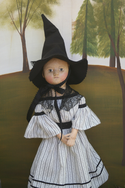 A wool felt hat and scrap of cobweb lace are all she needs to be ready for All Hallows Eve.See her red scallop topped boots showing out from under her dress.Her linen chemise is edged with a delicate hand gathered lace frill.