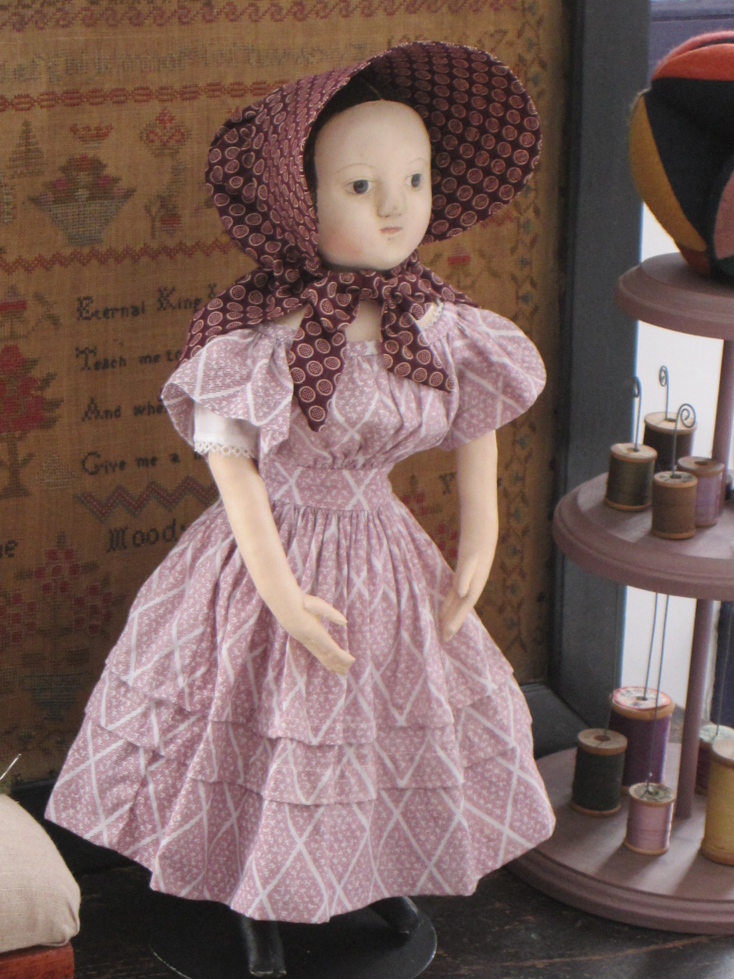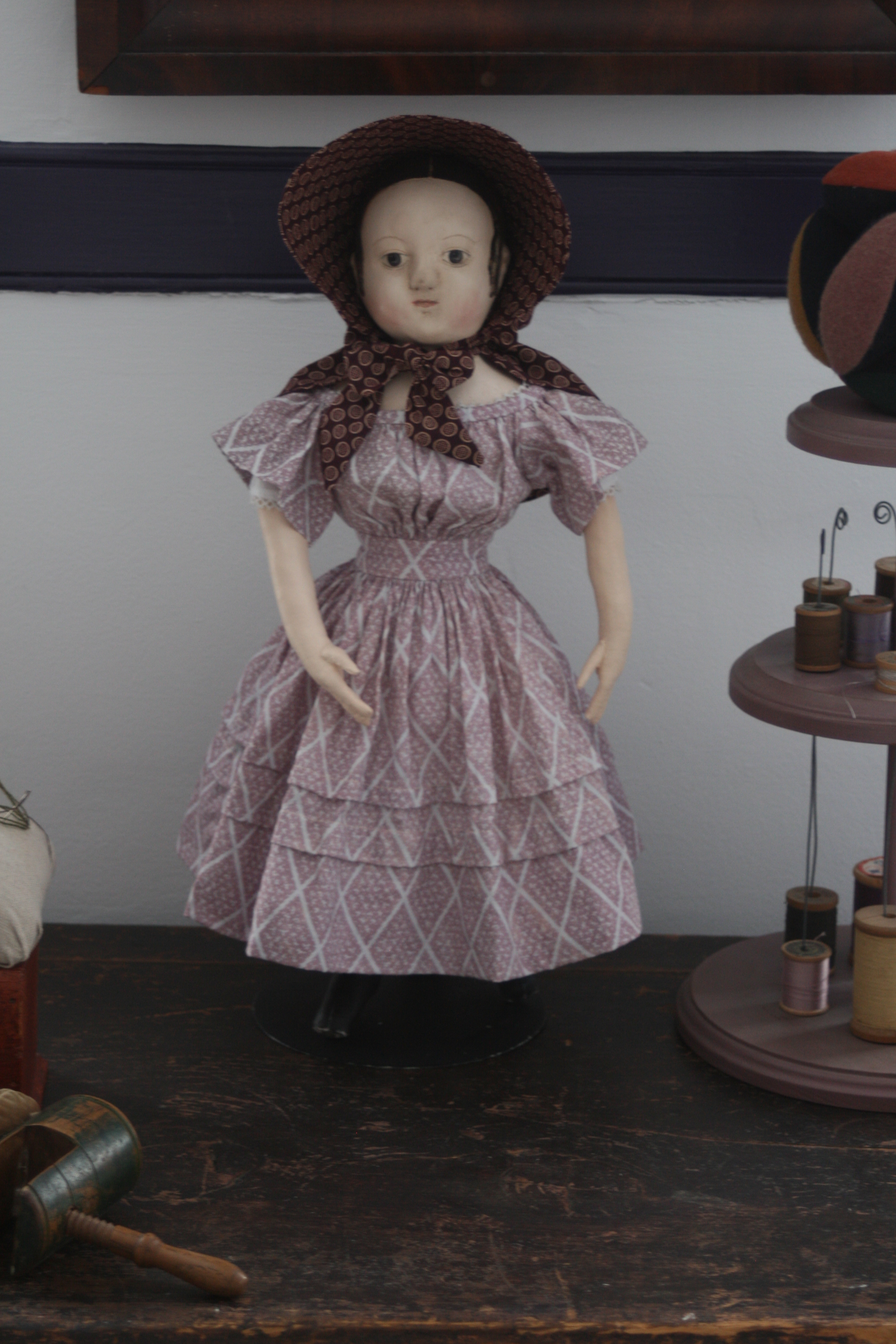 Full view of 18 inch Izannah Walker reproduction doll. She is wearing a dress made from antique “double pink” calico. Underneath her dress is a chemise, patelettes, two petticoat and painted shoes.