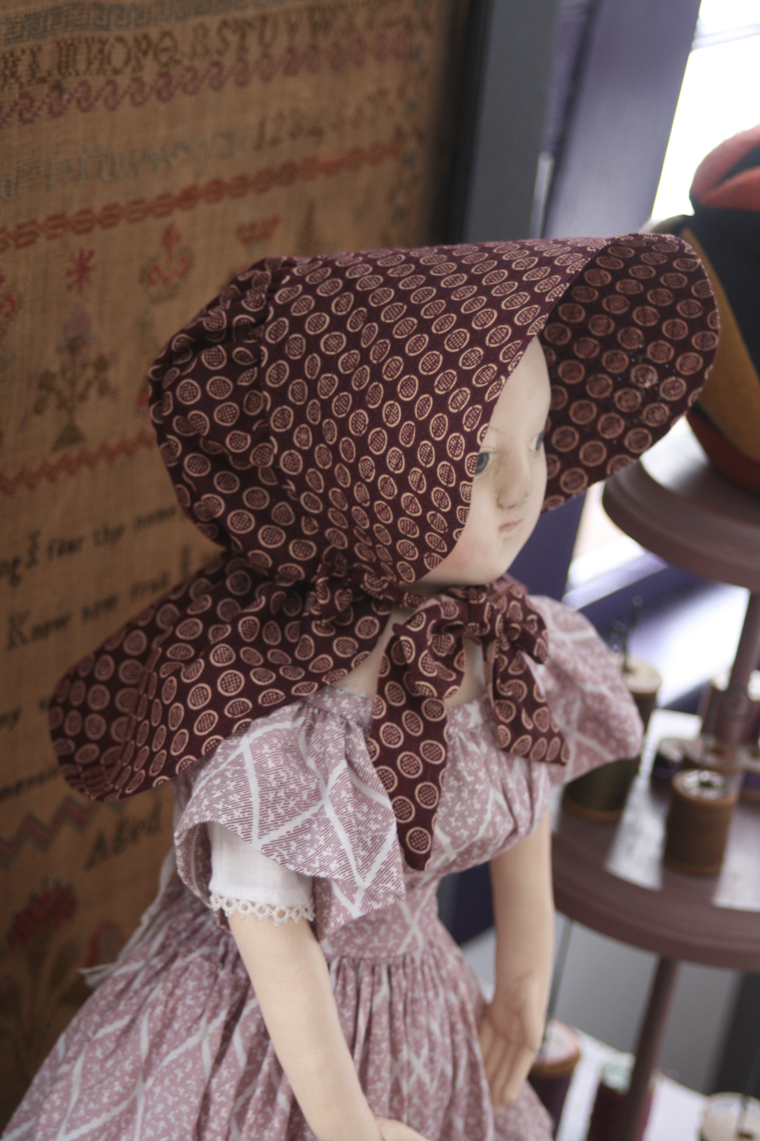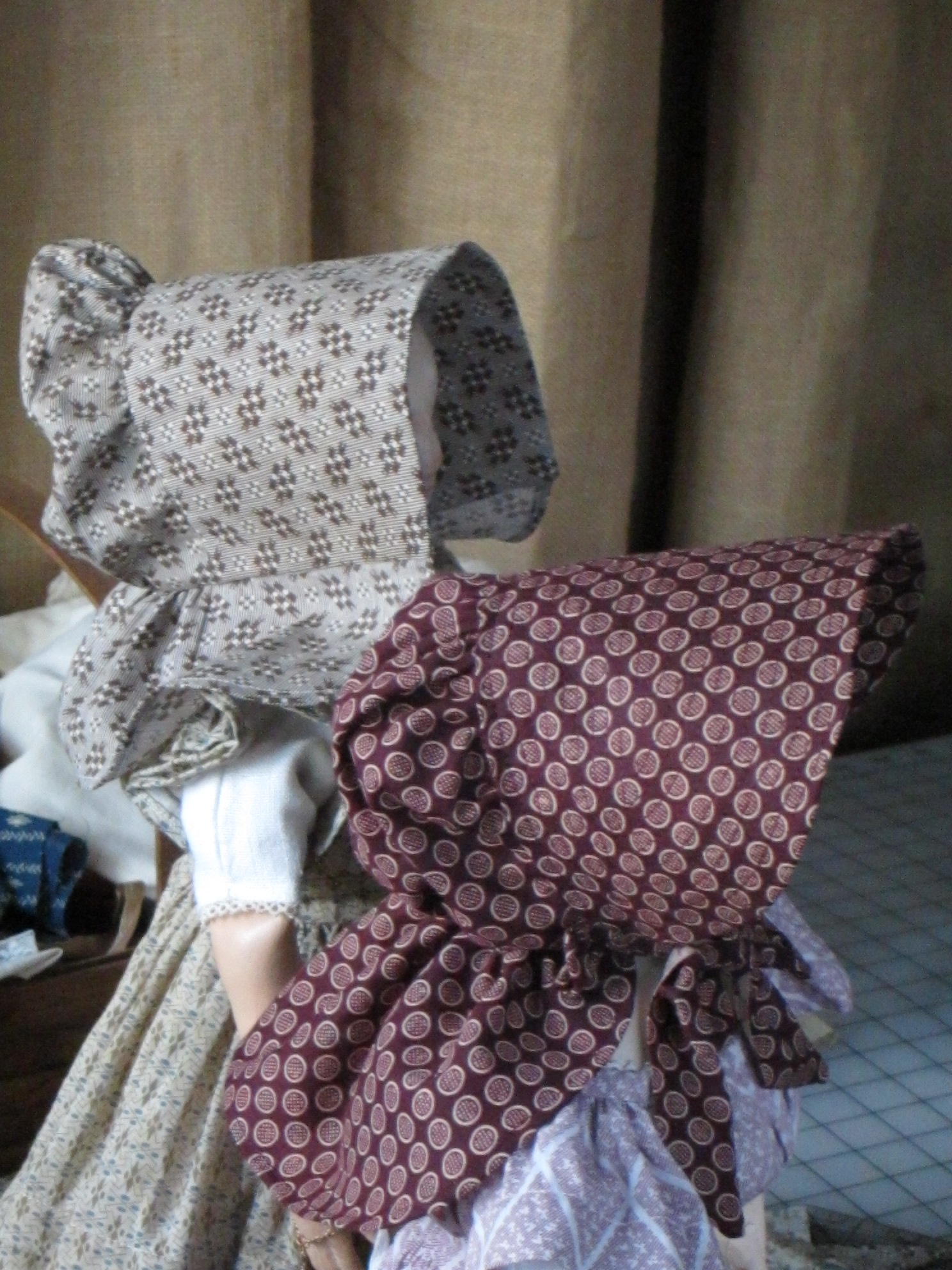 Before anyone asks again, no I don’t have a bonnet pattern for sale. 🙂 I cut both of these bonnets free hand. The plum colored bonnet comes purely from my imagination, aided by years of collecting antique bonnets and looking at even more examples in photos, at antique shows and shops, and in museum exhibits. The brown bonnet is based on a tiny antique doll’s bonnet that I purchased last year. When making bonnets I take into account the amount of antique fabric I have available, then hold the material up to the doll and start snipping away with my scissors!