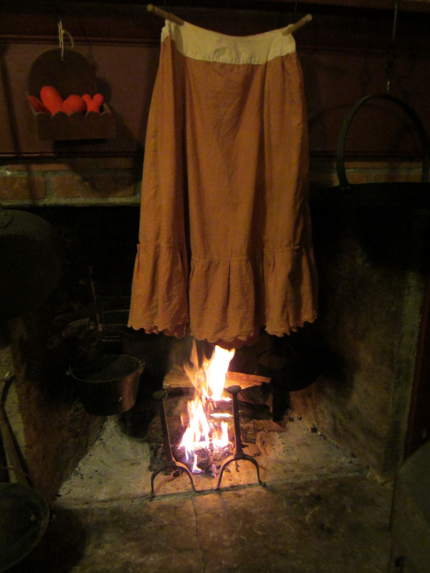 Her third dress is a very early Prussian blue and brown cotton paisley that almost, but one quite as sheer as gauze. It has tucked and gathered sleeves and a banded neckline. The fourth dress is True Blue’s wardrobe is a very sheer woven cotton fabric, that is reminiscent of cheese cloth in its open weave, with woven white and blue “dots”. It has a very full bodice, skirt and sleeves, with bands of cotton tape at the sleeves, neckline and waistband.