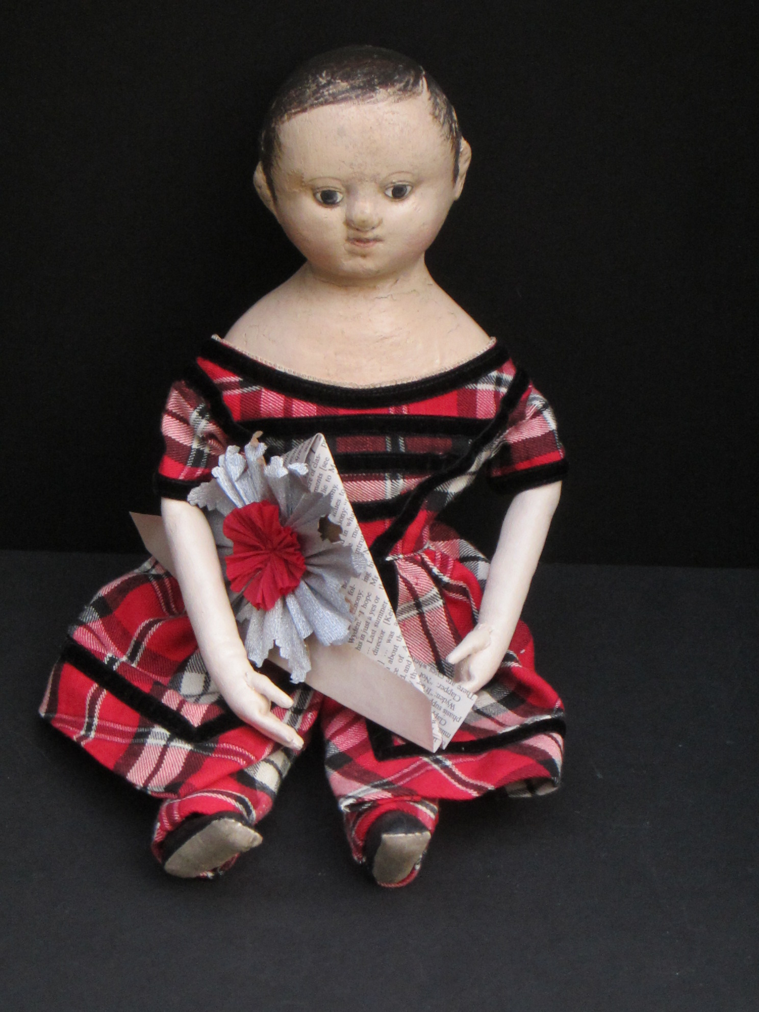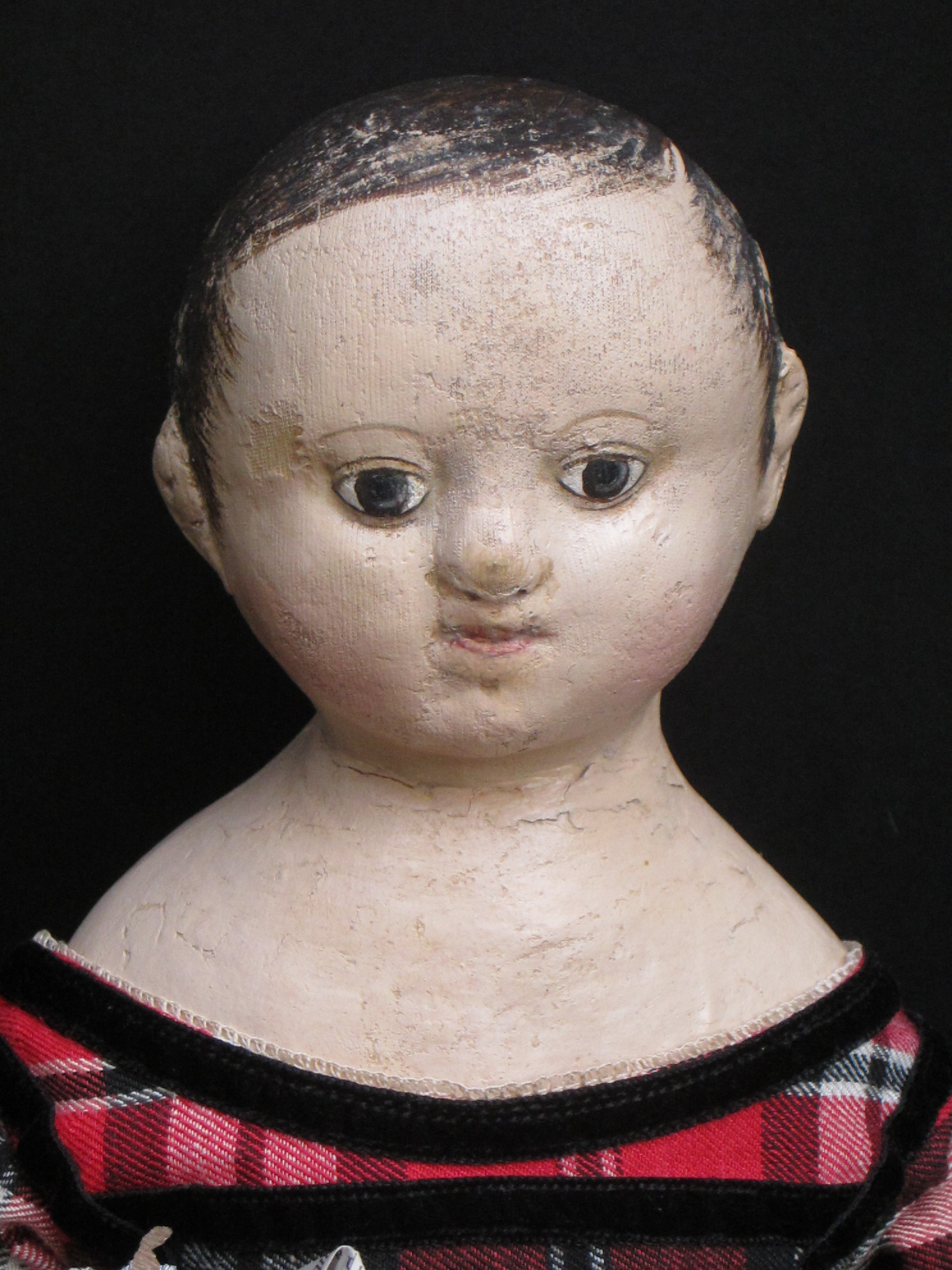 To enhance the baby like look of her face, I chose a rather uncommon Izannah hair style for her. The Carmel Doll Shop once had a magnificent antique Izannah Walker doll with hair painted similarly. If you frequent their website, you may remember her. She was dressed in an amazing off white dress with a great deal of white braid work trim and she wore a necklace of white beads. This hair style has very short wispy center parted bangs, with little fringes of hair at the temples brushed towards the face and six ringlets at the back of the head. Six is a very unusual number of long curls for an Izannah Walker doll, it is much more common to see five or seven. The large Izannah that I reproduce has nine.