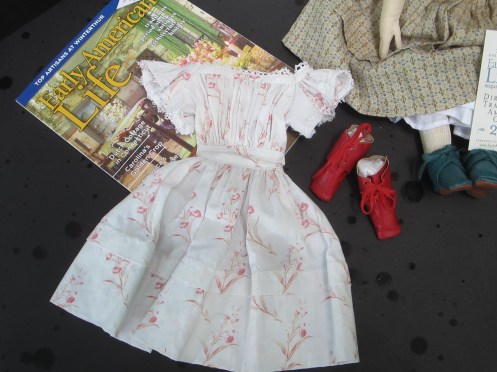 This doll has an antique pink linen second skin, like many of Izannah Walker’s earliest dolls did. Her dress is made from a wonderful thin white cotton, which has aged to a pale ecru. It has a skirt with four narrow tucks and a gathered ruffle of broderie anglaise, gathered sleeves banded with additional eyelet trim, an antique cotton tape drawstring at the neck of the dress, which is embellished with eyelet and tatting, and a wide waistband with eyelet and embroidered cotton ribbon. Her chemise is made from antique lace trimmed cotton and her pantalettes were originally part of a pair of women’s 19th century panteletts. She has two petticoats made from antique cotton and broderie anglaise. Her stockings were made from bits of antique cotton stockings and her shoes are handmade red leather.