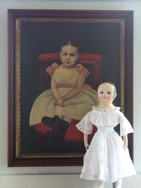 We’ve hung the portrait in our parlor, so that she over looks the wing-back chair and Sheraton sewing table, where I sit in the evenings to do my hand sewing. That way whenever my thread tangles, I have to rip out stitches, or just generally need a bit of encouragement, I can look up for inspiration. This tiny girl is a gentle guide to the look and feel of long past childhood, that I strive to convey in all of my dolls. I am so happy to have found her!