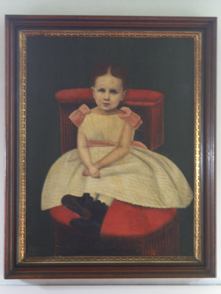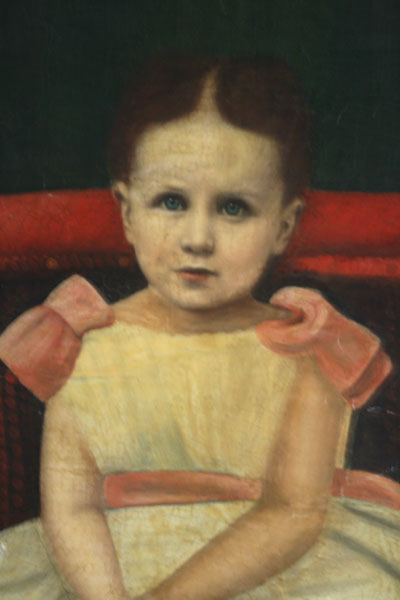 Last month, when I went to the Harwinton (CT) Antiques and Design weekend, I happened across this fantastic portrait. At the time I had just spent several days painting scallop topped boots on what felt like an entire army of tiny feet and sewing yards and yards of gathered white ruffles and lace. Finding this painting felt like the hand of fate.