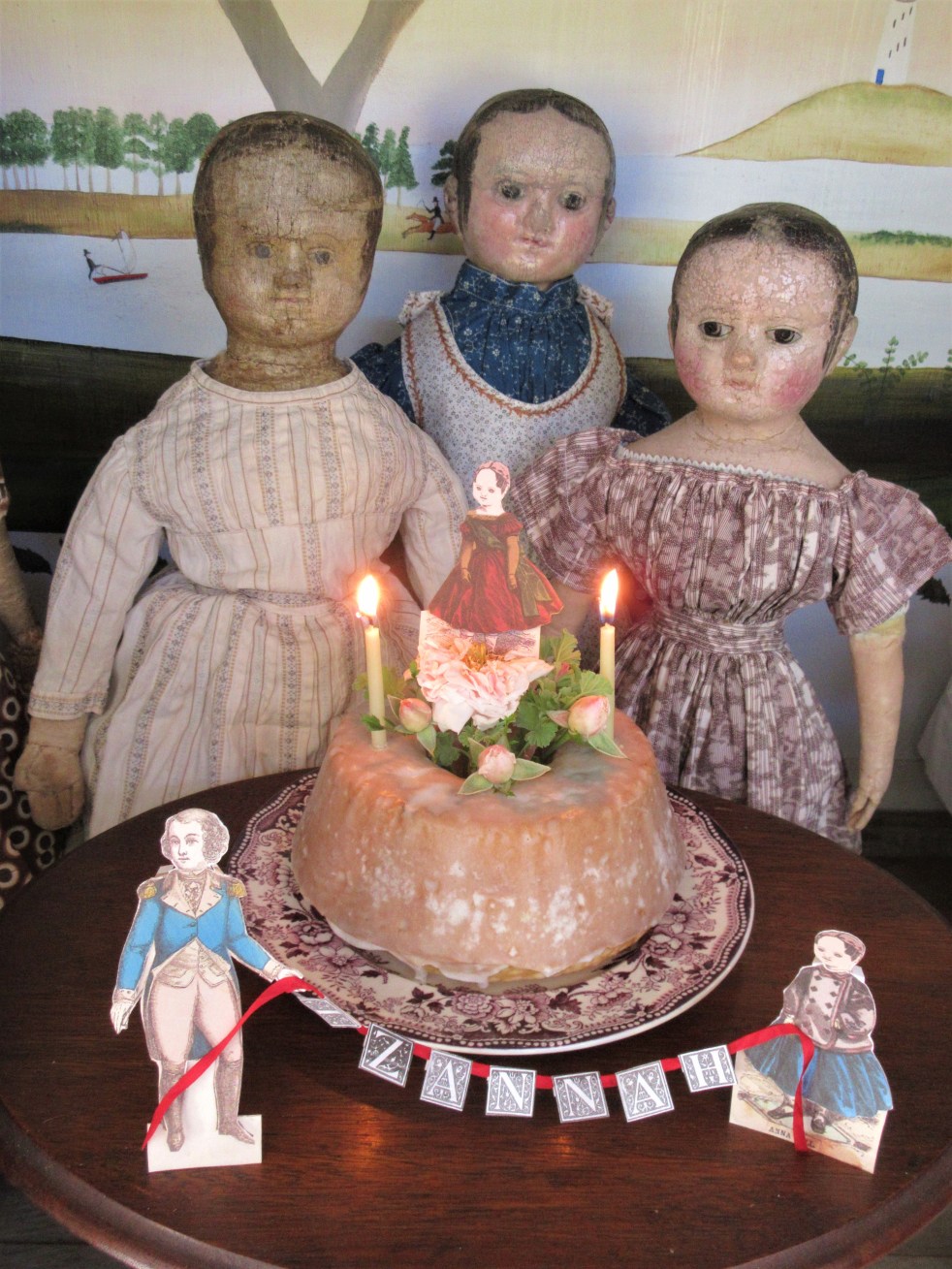 Remember this? I invited you all to email me a short birthday message along with a photograph of your Izannah Walker doll – antique originals, reproduction dolls that I have made for you, or a doll that you have made yourself in tribute to Izannah’s dolls!