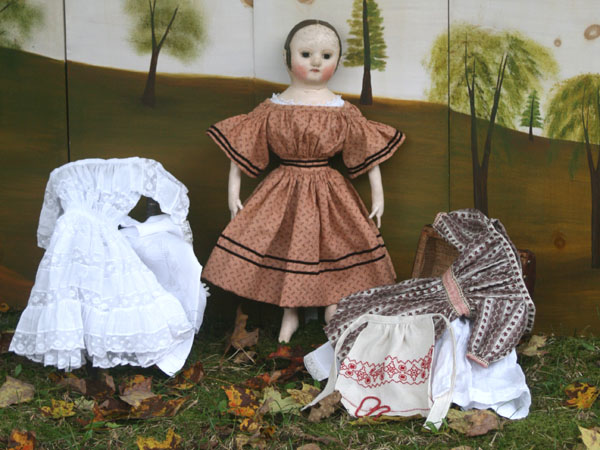 Even though I was rushing to beat the rain and falling darkness, I had the best time yesterday taking photos of this doll.  It was great fun to “play dress up” with her.  Her extensive wardrobe includes three dresses, two chemises, two pairs of pantalettes, two petticoats, an apron and a real coral bead necklace.  If you’d like to add more pieces to her wardrobe I can make her hand made leather shoes, a cotton sunbonnet and a straw bonnet.