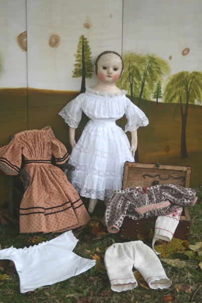 Izannah Walker’s dolls have had long and eventful lives. Numerous things have happened to them since they were first made by the Walker sisters and their aunt. Many of the dolls have been either partially or completely repainted, some have replaced limbs and second skin body coverings. Along the way, they have lost and acquired pieces of clothing.  All of these occurrences sometimes make it difficult for collectors to determine exactly what parts of the doll are original, or are later additions and repairs.