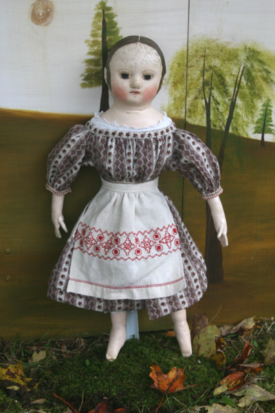 Izannah’s earliest dolls, beginning in 1845 and ending sometime before 1855, have faces that are a bit longer and slightly square in appearance. The dark brown painted lines surrounding their eyes and eyelids are very thin and fine, without a lower lid line. Highlights in their irises are fainter to non-existent. Their ringlet curls are painted in a more primitive folk art manner.  They have slightly broader, flatter noses, and much longer arms with slightly larger hands. Their bodies have wider waists and hips, with a body covering that is generally made from white or pale pink linen cambric.