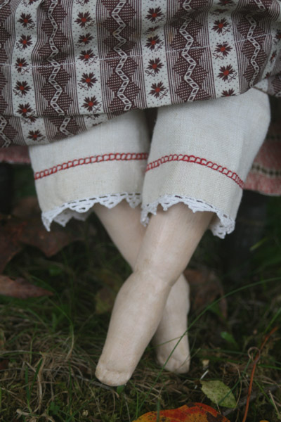 SOLD - This view shows her tiny stitched toes peeping out from beneath her pantalettes. The pantalettes have Turkey red embroidery to match her apron and crocheted lace in a triangle pattern that echos the zig-zag stripes in her dress fabric. Look at the coordinating fabric lining the "false hem" of her dress.