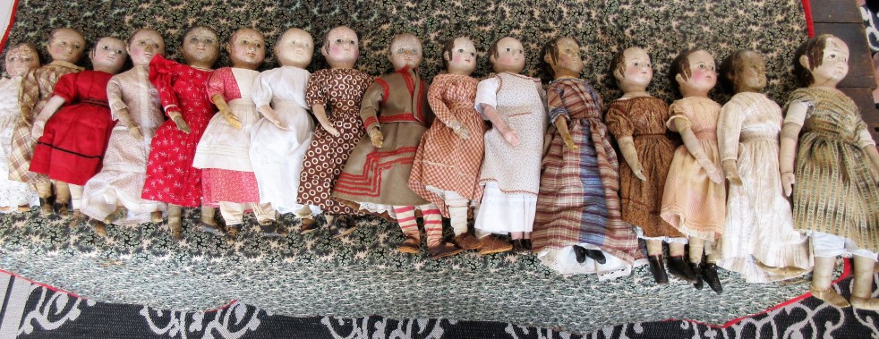 Some of the antique Izannah Walker dolls that appeared in the October 2017 special exhibit that I curated for the Jenny Lind Doll Show. Arranged by height, from 14 to 22.5 inches.