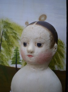 Another point that I would like to mention here is that when studying photographs of Izannah Walker dolls, it is important to remember that the photographs do not always look the same as the doll does in person. I am by no means a professional photographer, but I am a person who takes an inordinate number of doll photos, using several different cameras and lenses. The type of lens used to take a photograph will have a big impact on how the doll looks, as will the lighting and angle from which the photo is taken. People who have only seen Izannah Walker dolls in photographs are often very surprised when they first see one of the dolls in person. The dolls are smaller and much more delicately proportioned than they often look in photos. Their eyes are not as large and their foreheads aren’t quite as curved and pronounced as people expect. I am fortunate enough to have been able to visit several museums and view dolls in person that I had previously only seen in photos and I can attest that there is a real difference. I see this same difference when I photograph both my antique Izannah Walker dolls and the reproductions of them that I make. So some Walker dolls may look more similar in person than they do when compared in photographs. Especially when they are photographs taken by different people, using different cameras, lighting, etc.