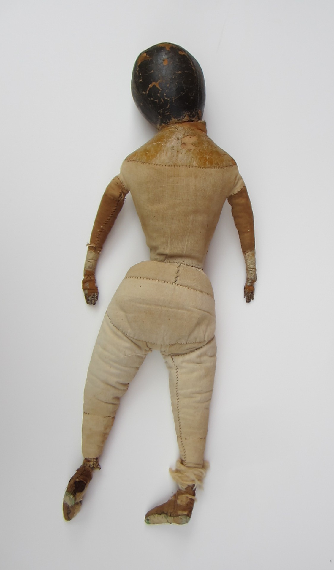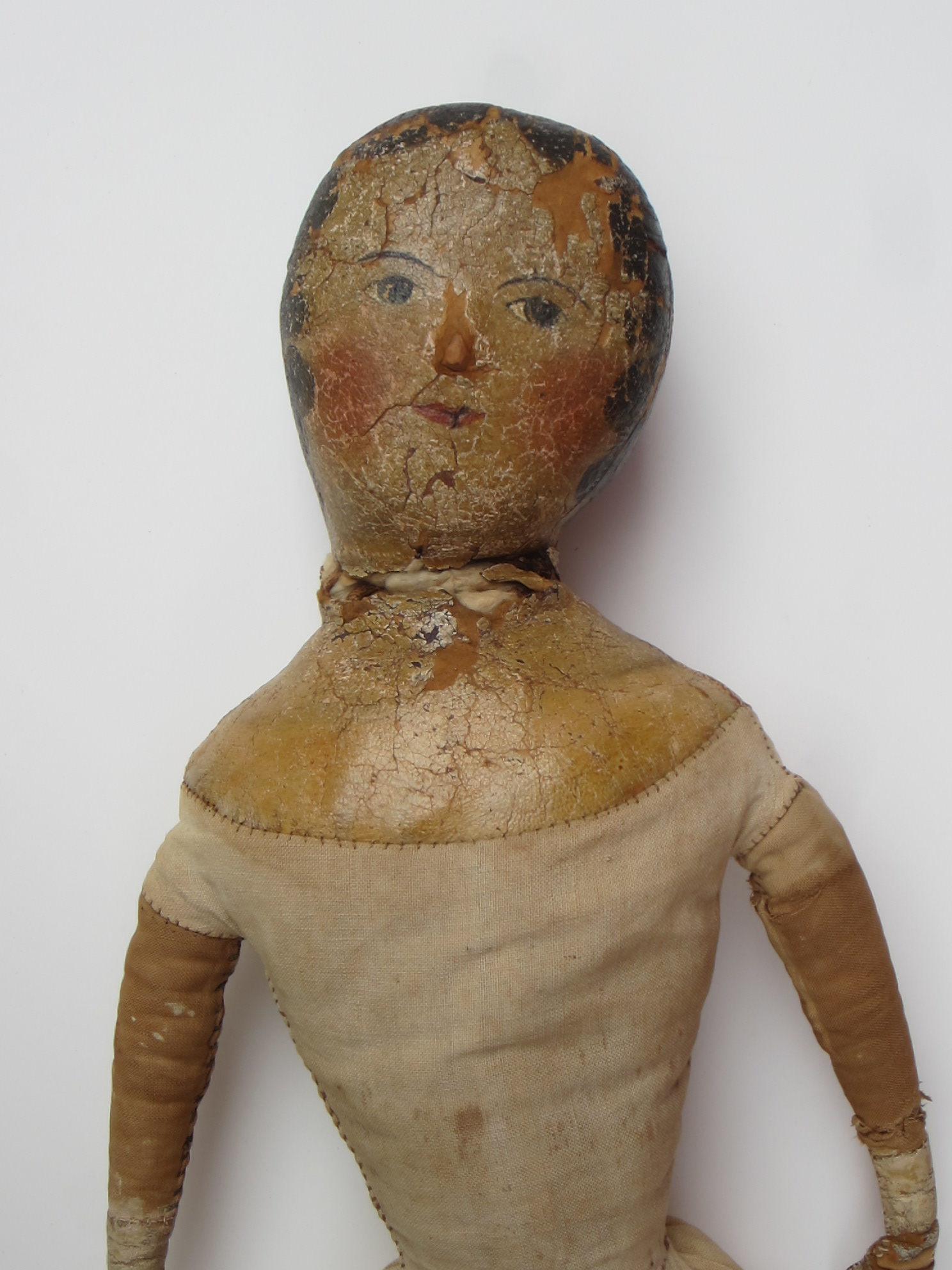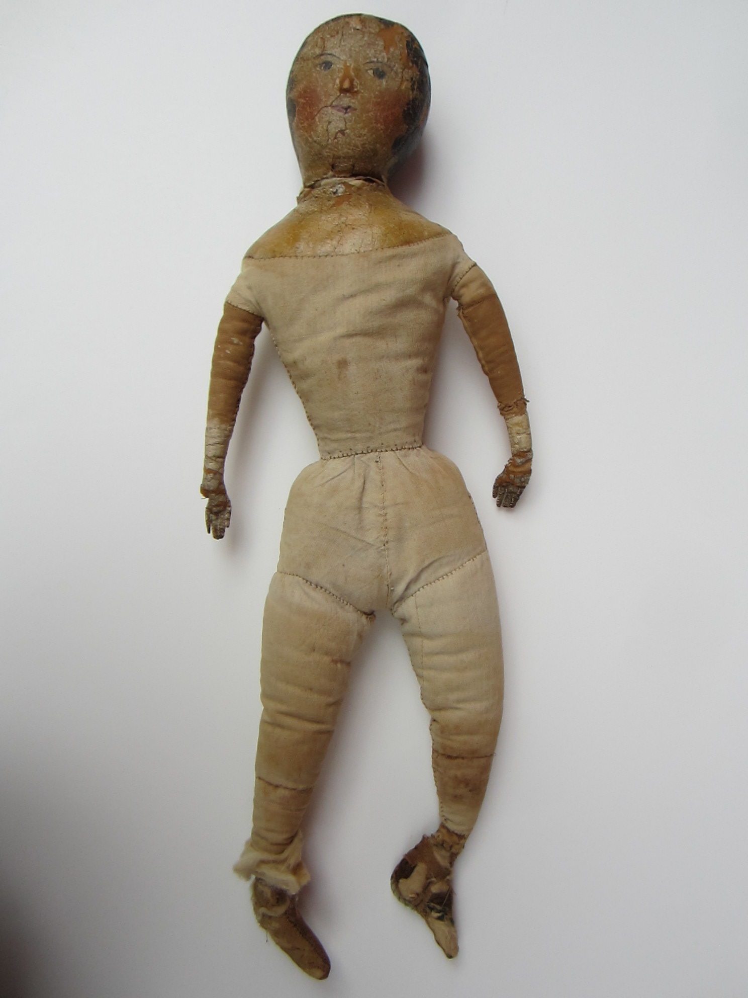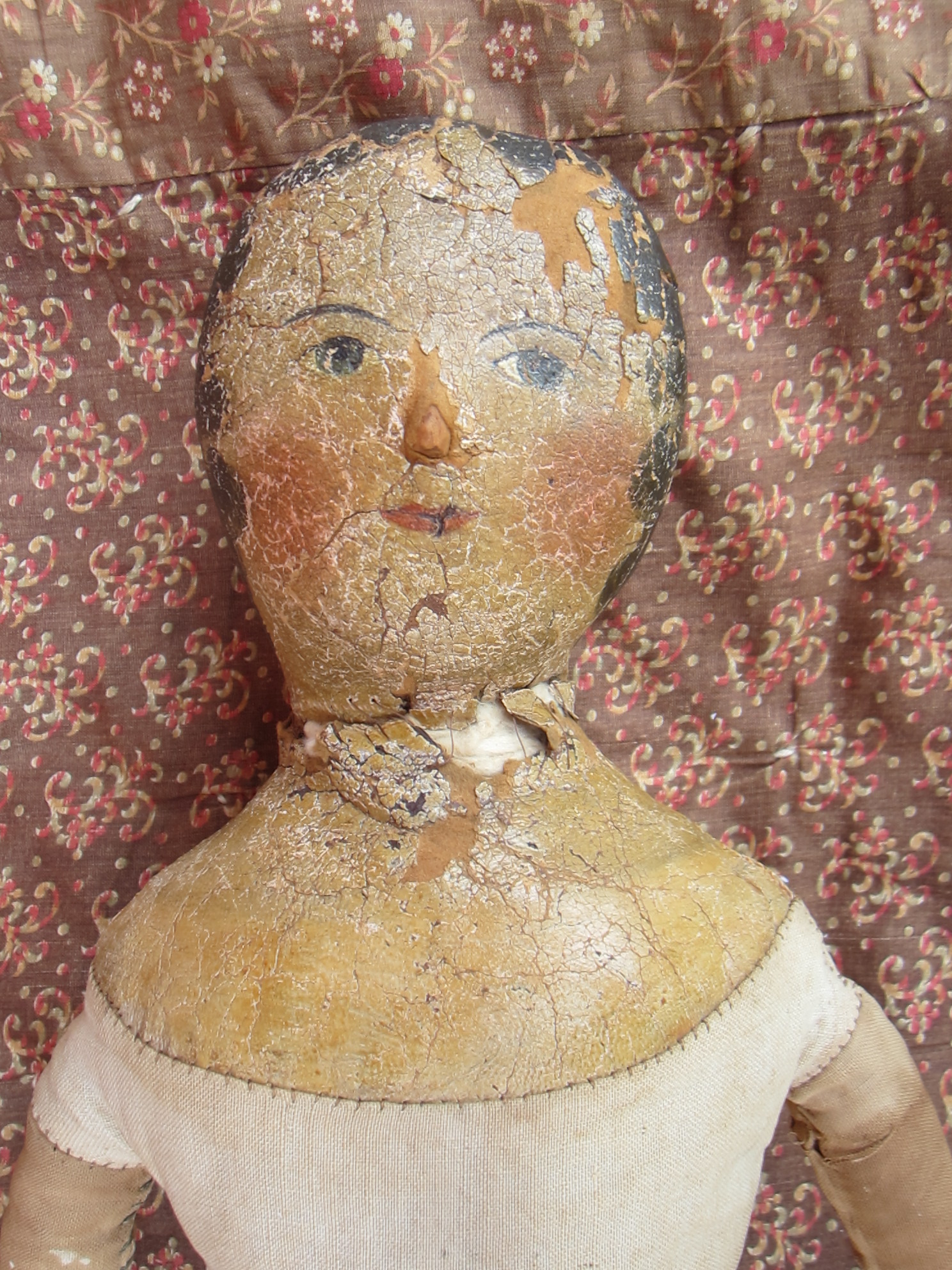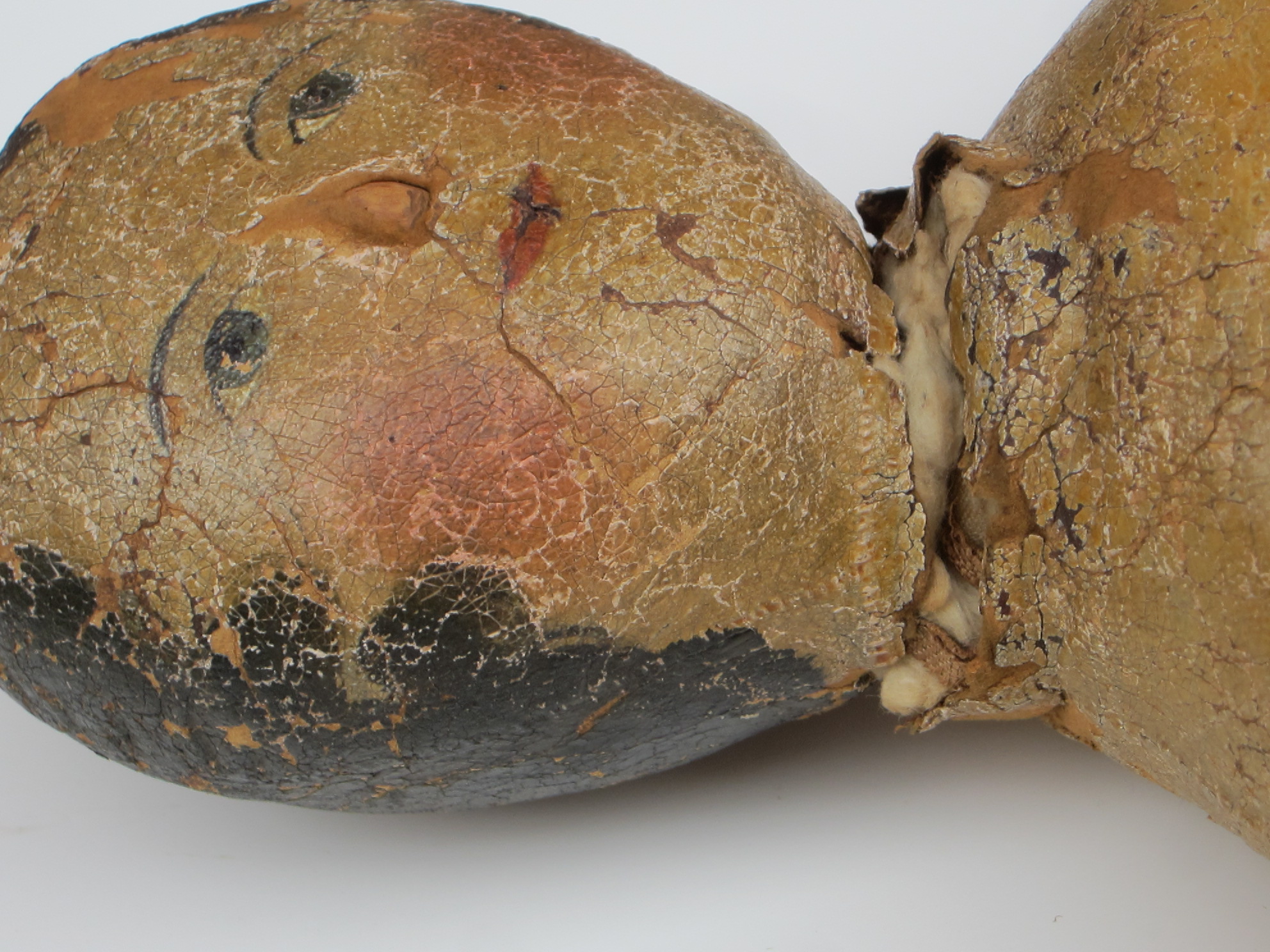 The neck of the doll suffered a lot of wear and tear over the years. Portions of the painted cloth are missing.