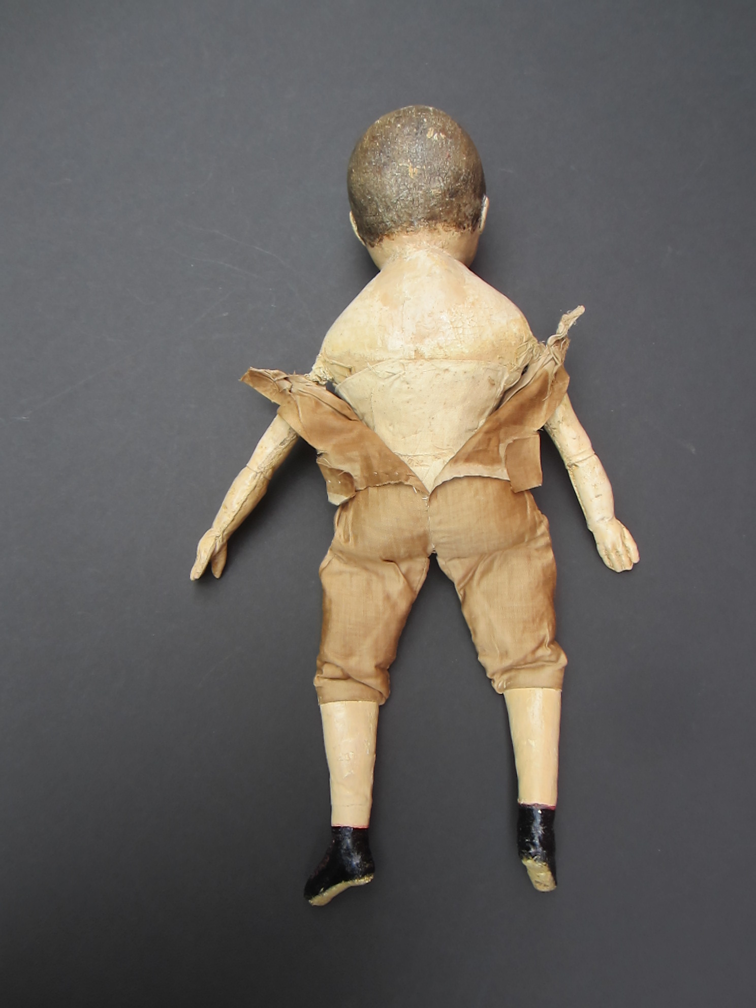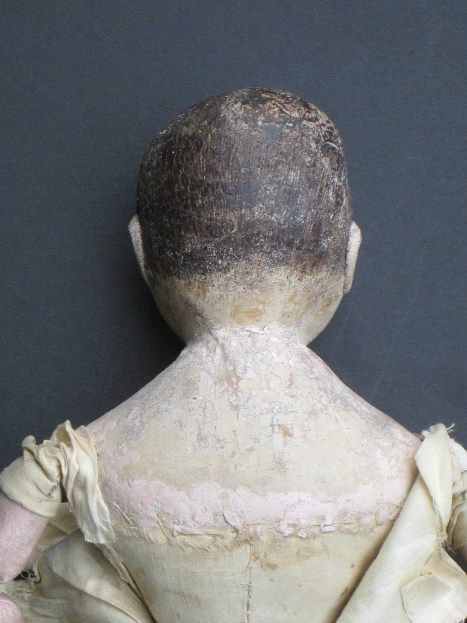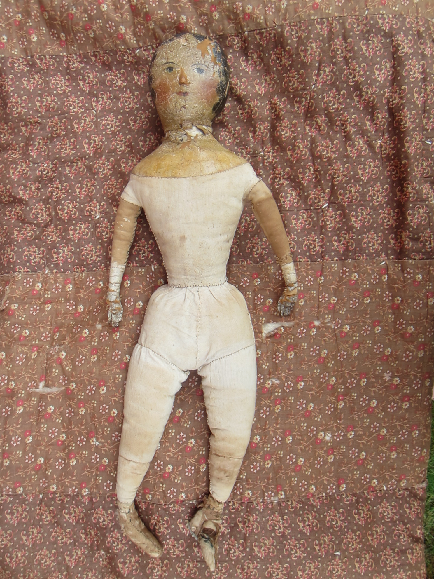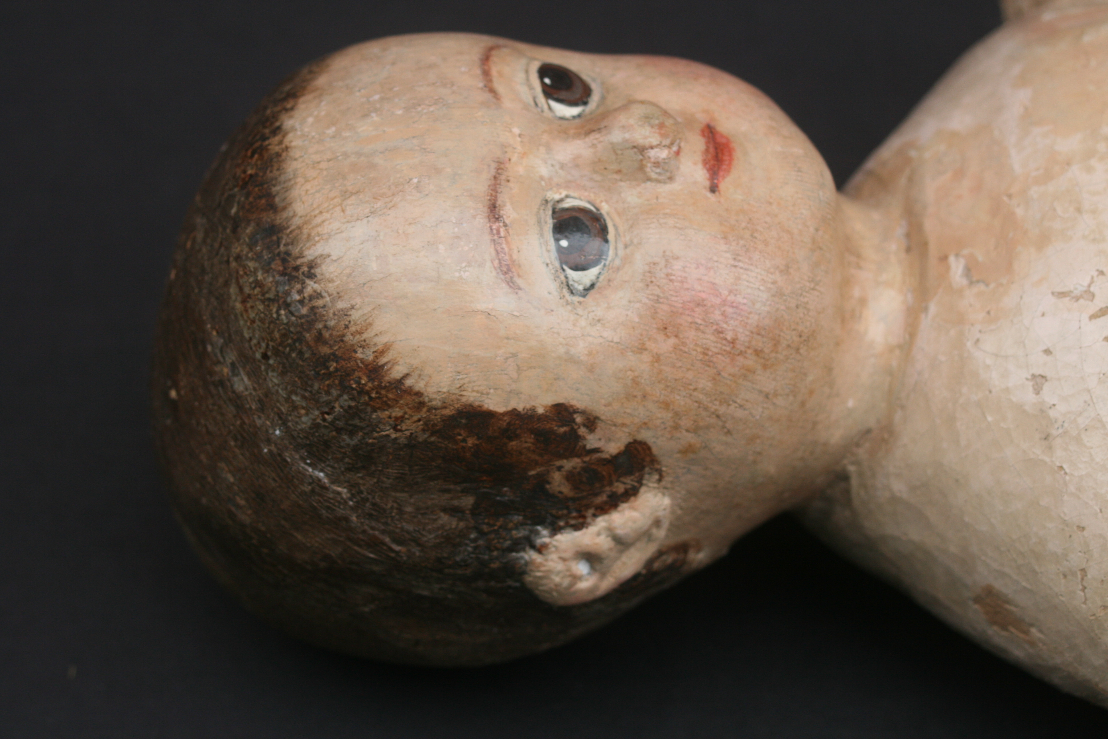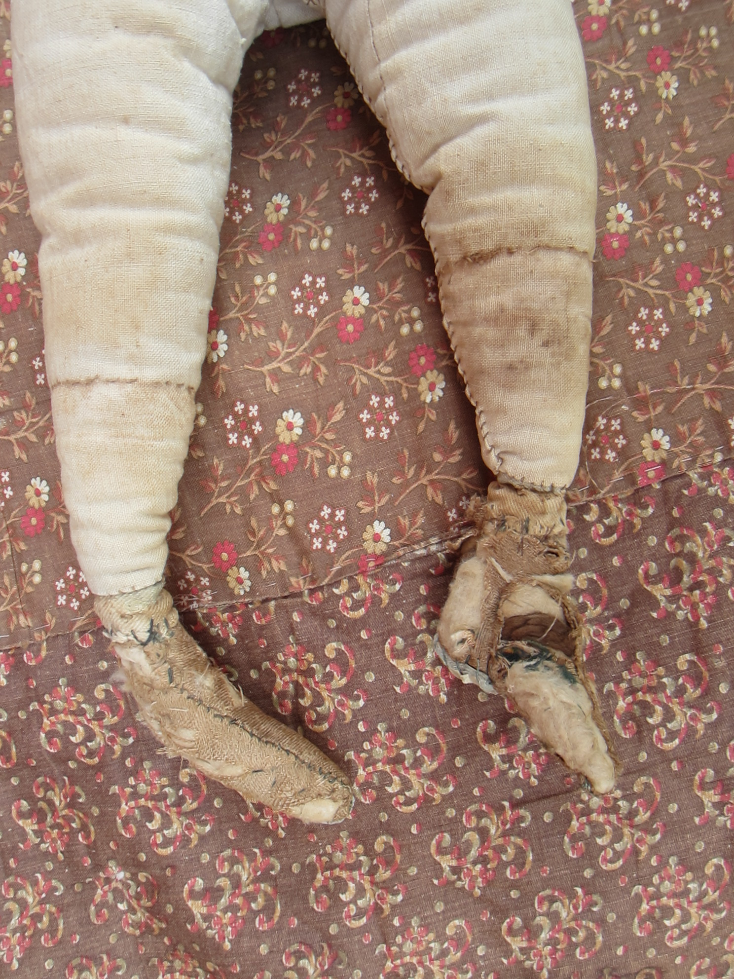 The neck of the doll suffered a lot of wear and tear over the years. Portions of the painted cloth are missing.