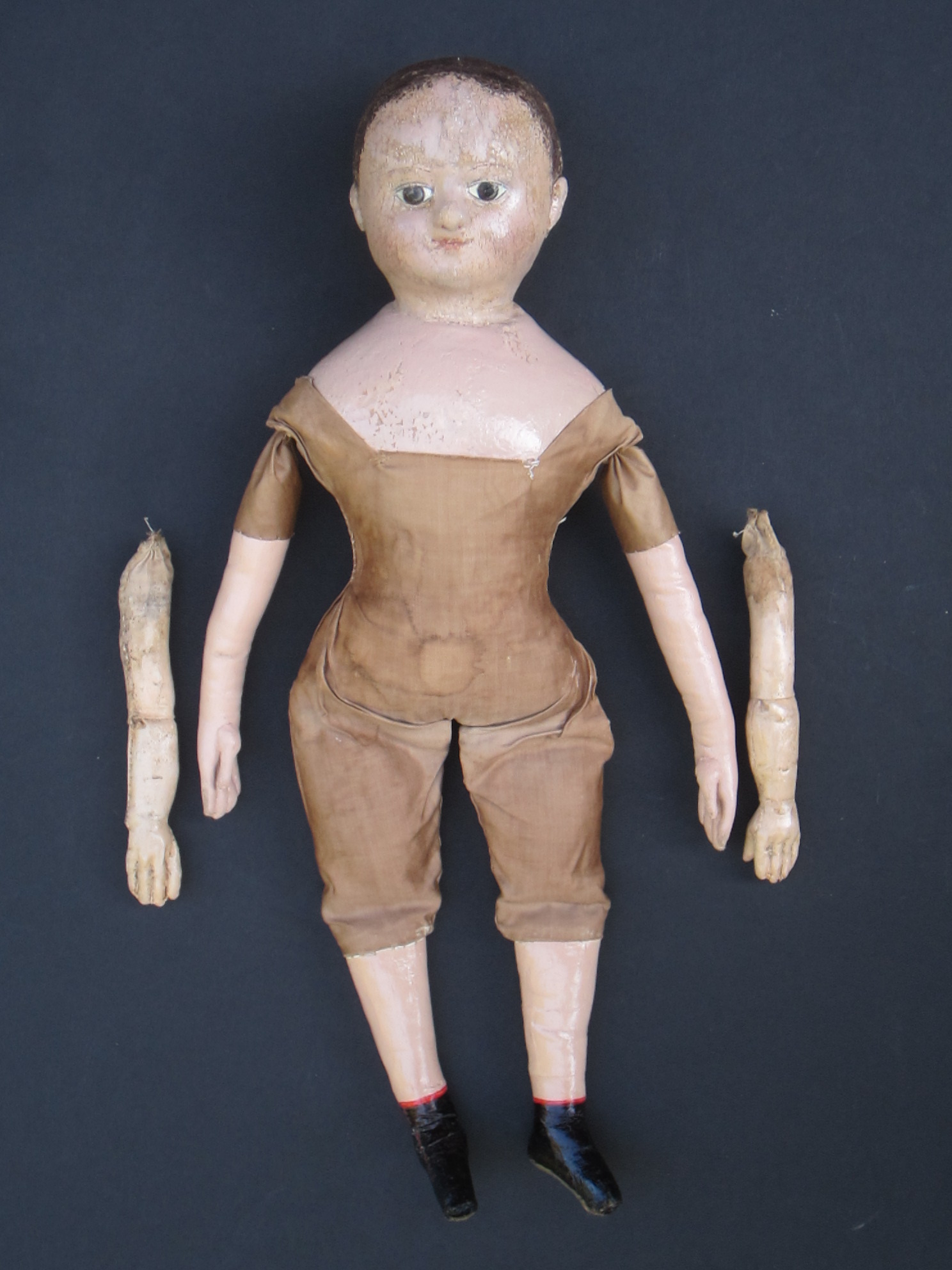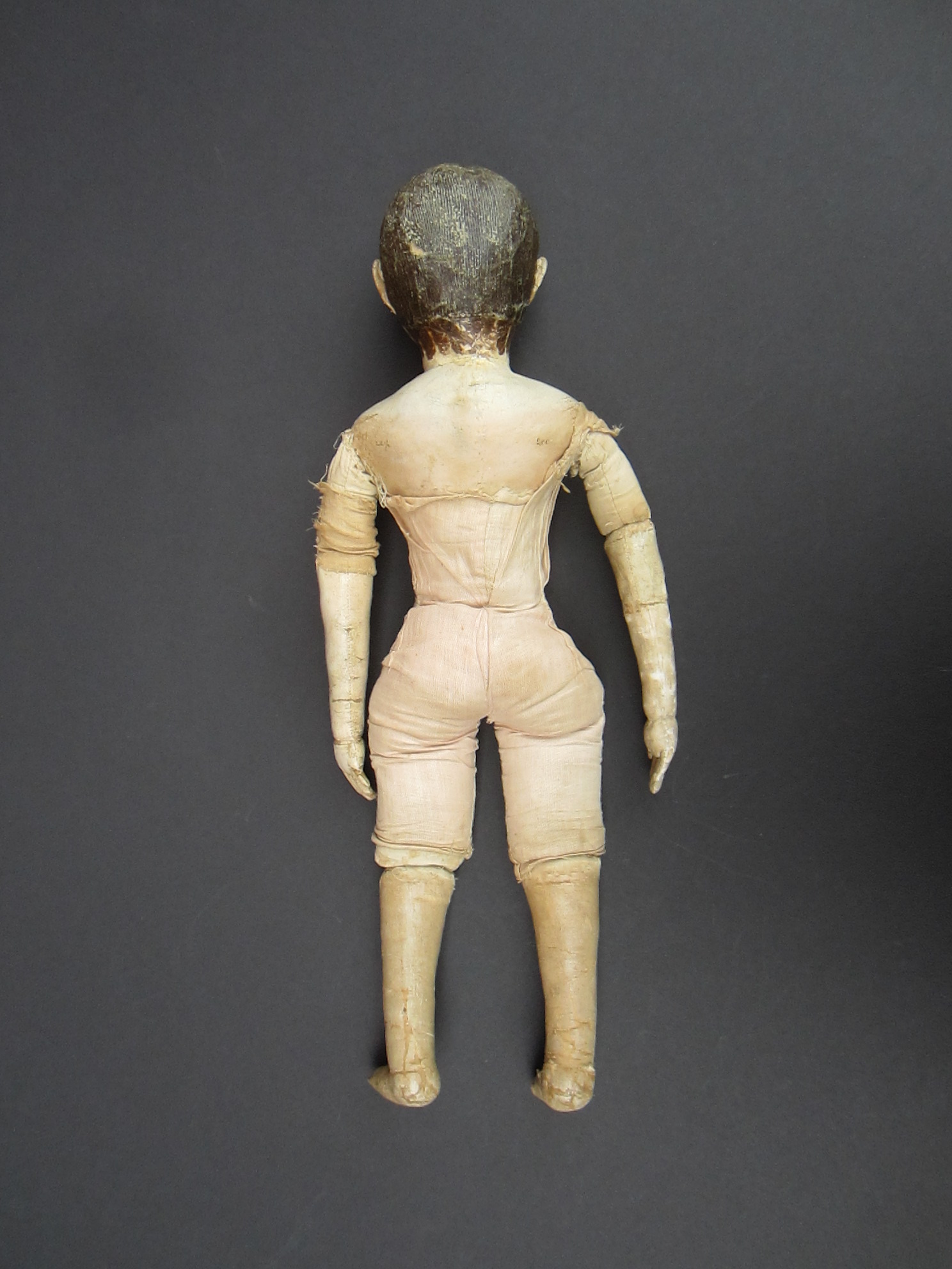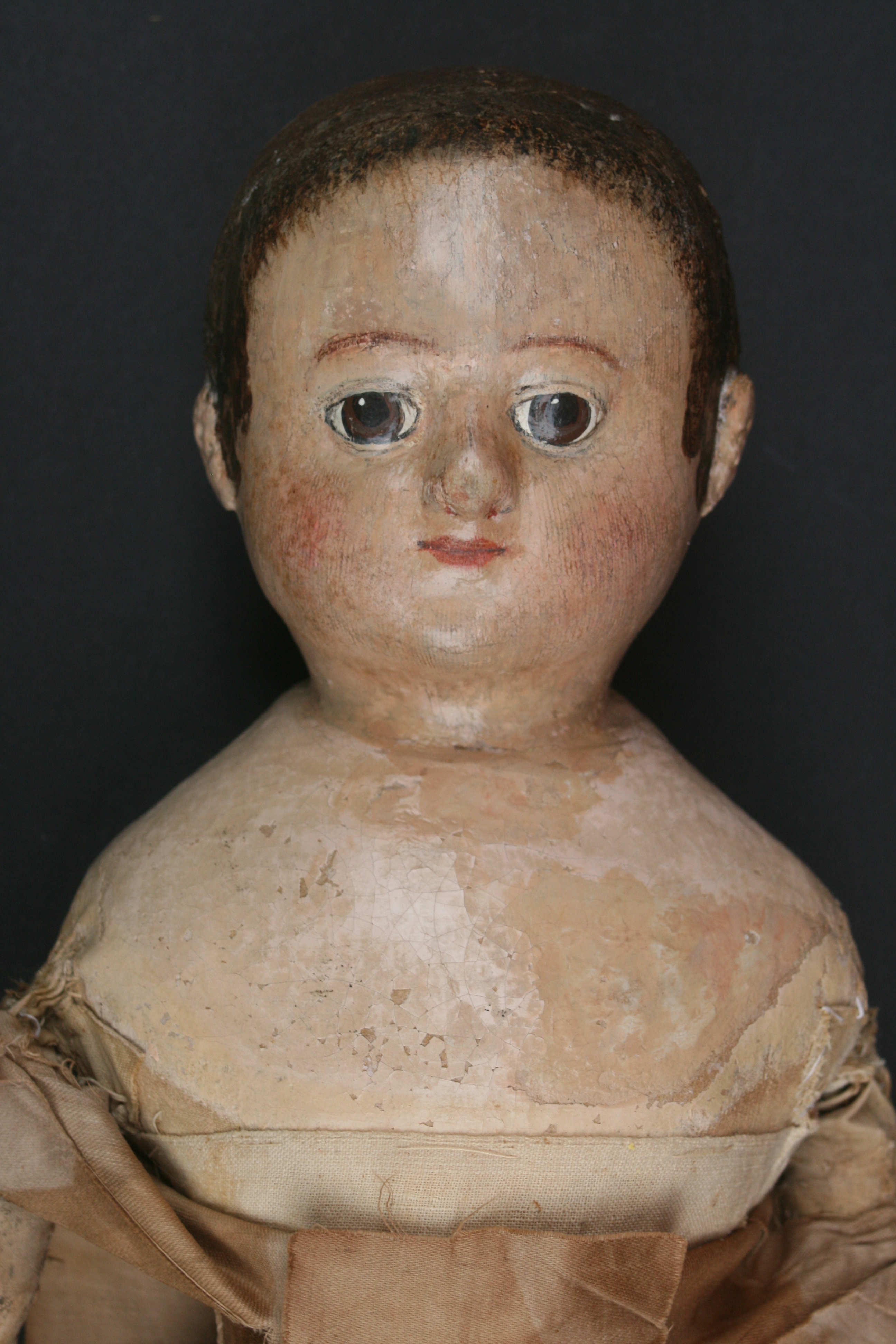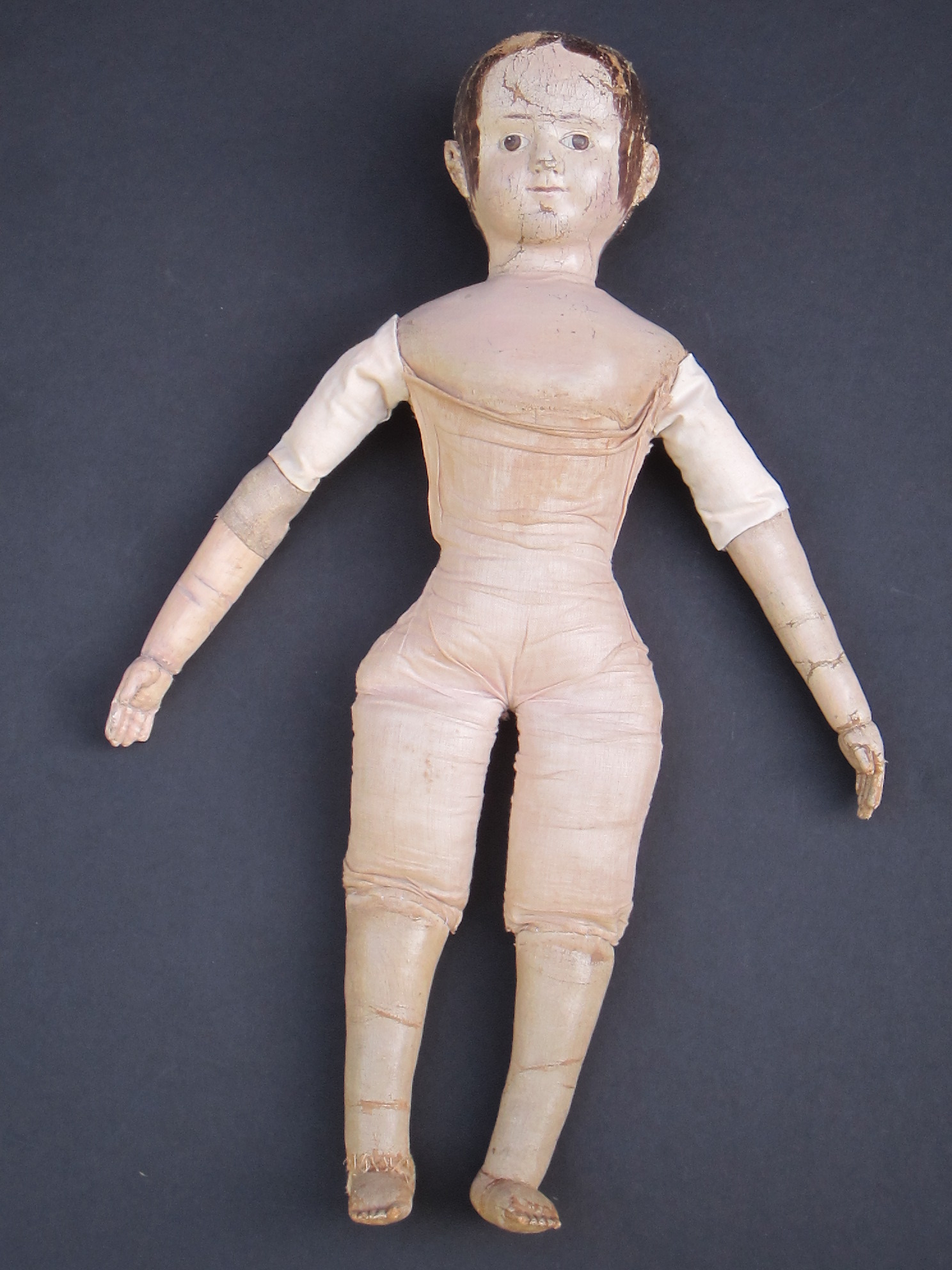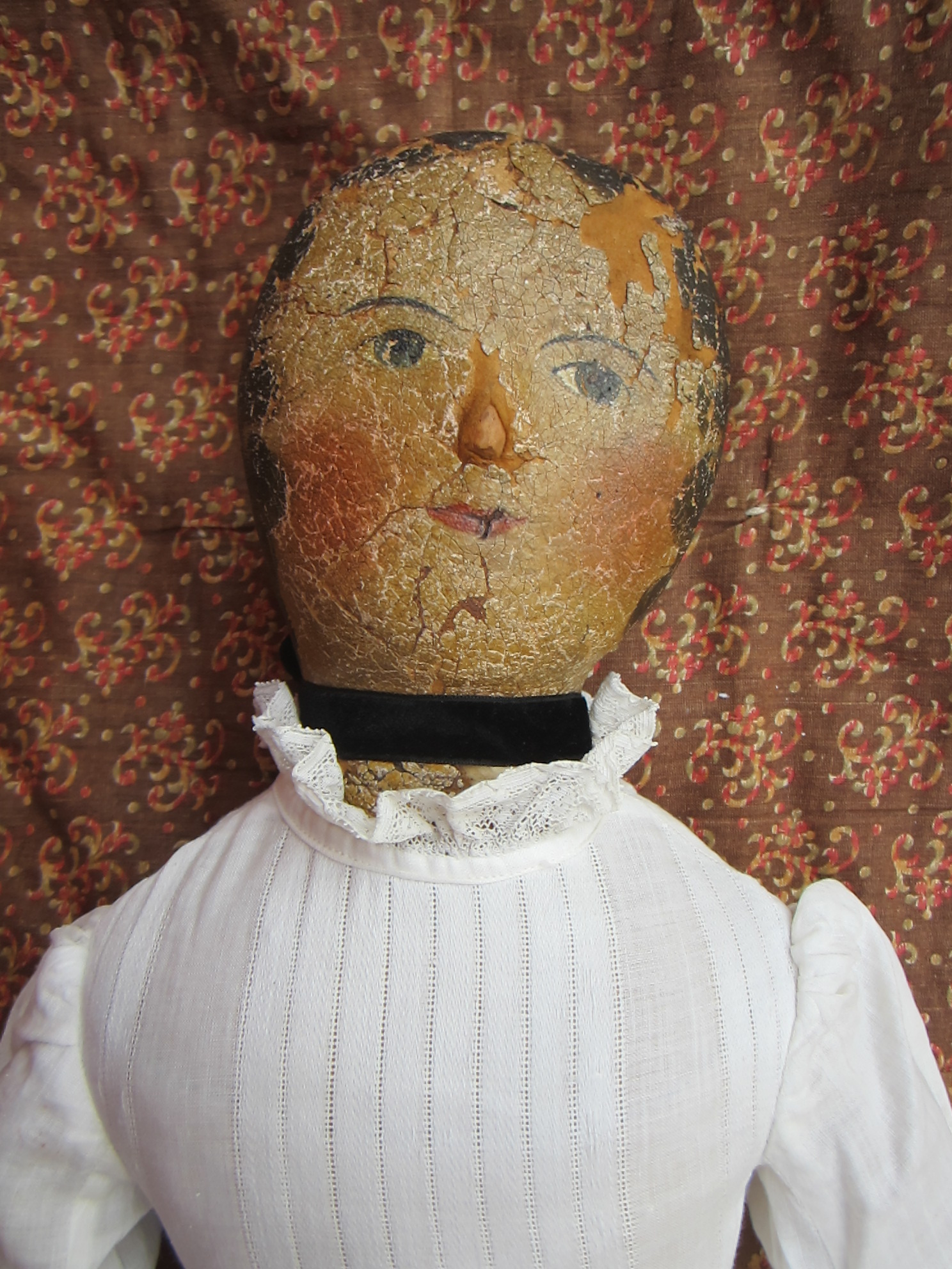 The neck of the doll suffered a lot of wear and tear over the years. Portions of the painted cloth are missing.
