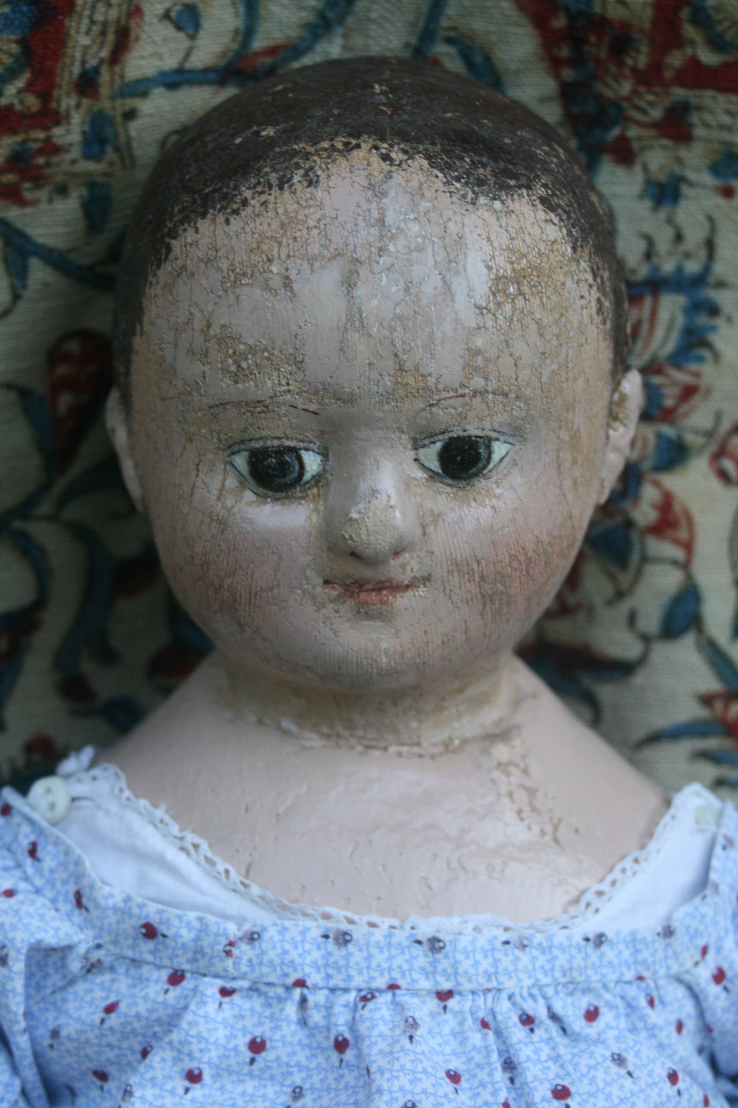 One day, out of the blue, my dear friend Susie called to tell me that she had purchased an antique Izannah Walker doll. The doll was in such bad shape that no one else at the doll show she attended was interested in buying her, even though some people did realize that she was one of Izannah’s dolls. Chief among several issues was the very heavy repaint on the doll’s head and shoulders. Thinking that she certainly couldn’t make the doll look worse than she already did, Susie gathered her courage and began removing layers of paint. Finally working her way down to the remains of Lily’s original layer of face paint. What emerged was a charming, classic pre-patent Izannah Walker doll. In due course Susie and Lily journeyed to Connecticut and it was agreed that Lily would stay to visit my family of Izannahs while I endeavored to bring back some of her former glory.