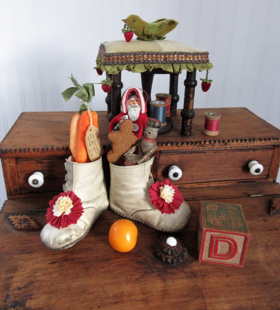 Before and After… a decorating idea ❤ Antique Baby Shoes w/ handmade spun cotton carrots to leave out for St. Nicholas’ horse on the night of December 5th, displayed with antique toys, small treats and a spun cotton Santa to depict the items children find left in their shoes. Antique baby shoes and spun cotton carrots sold as a set. Spun Cotton Santa sold separately. All other items are for display purposes only and are not for sale.